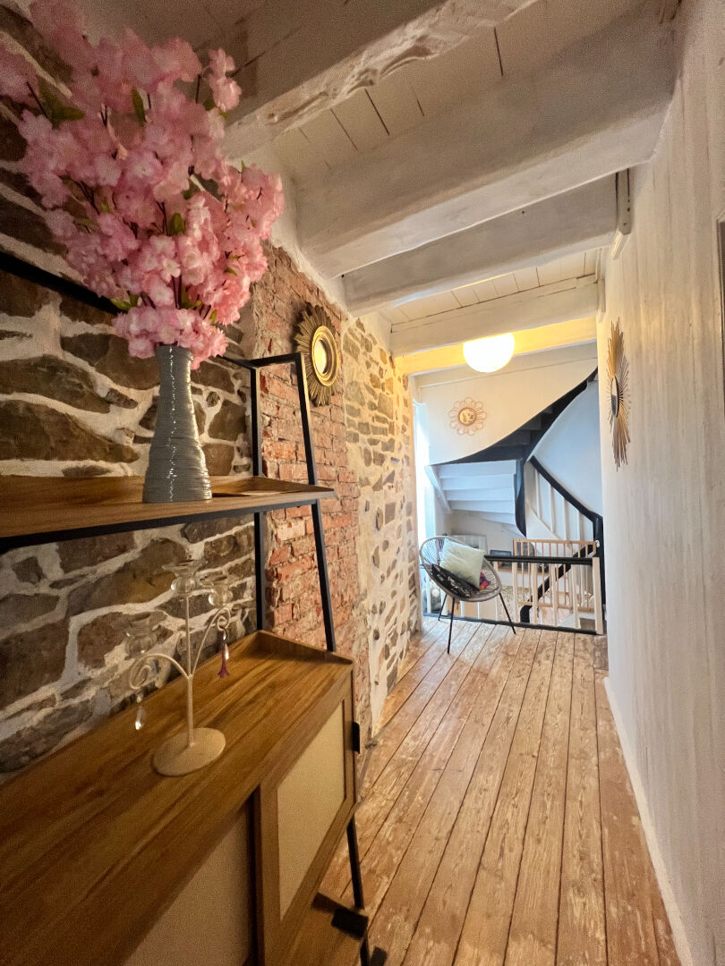 - au premier étage : un charmant palier avec parquet et pierres, desservant une suite parentale avec chambre de 16 m², une salle de douches avec wc et un dressing, une seconde chambre.