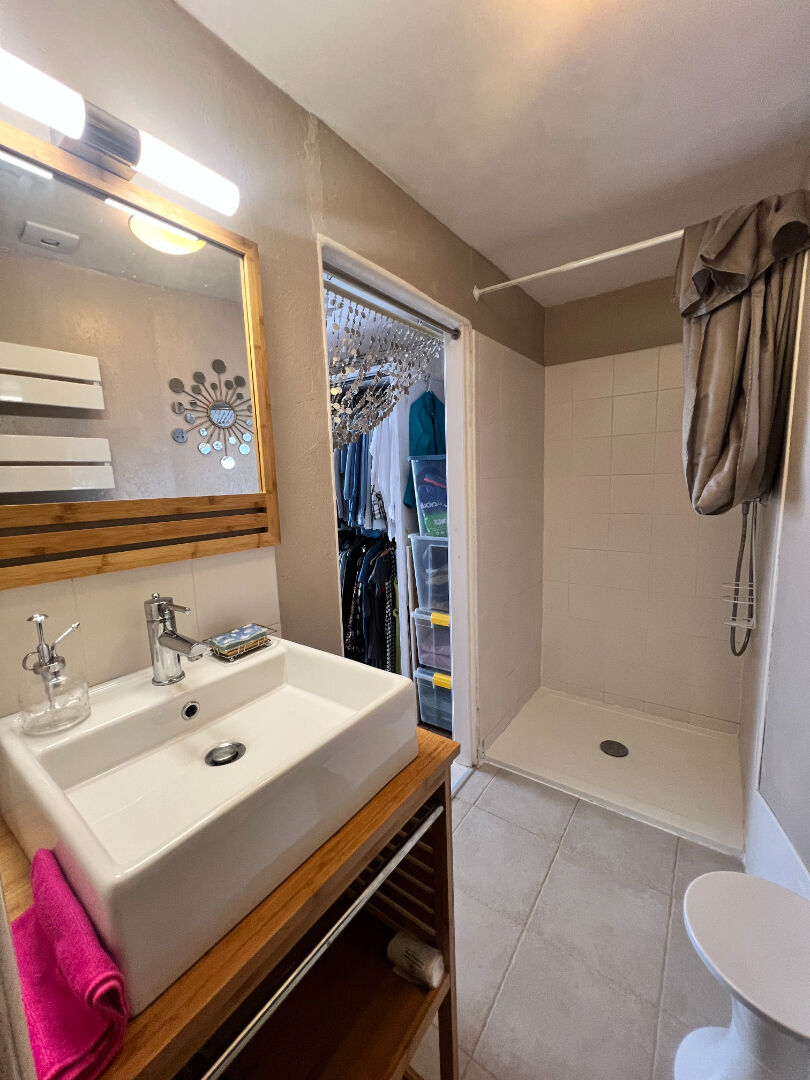 - au rez-de-chaussée d'une pièce de vie lumineuse avec cuisine équipée, une salle de bains, des rangements et un wc indépendant.
