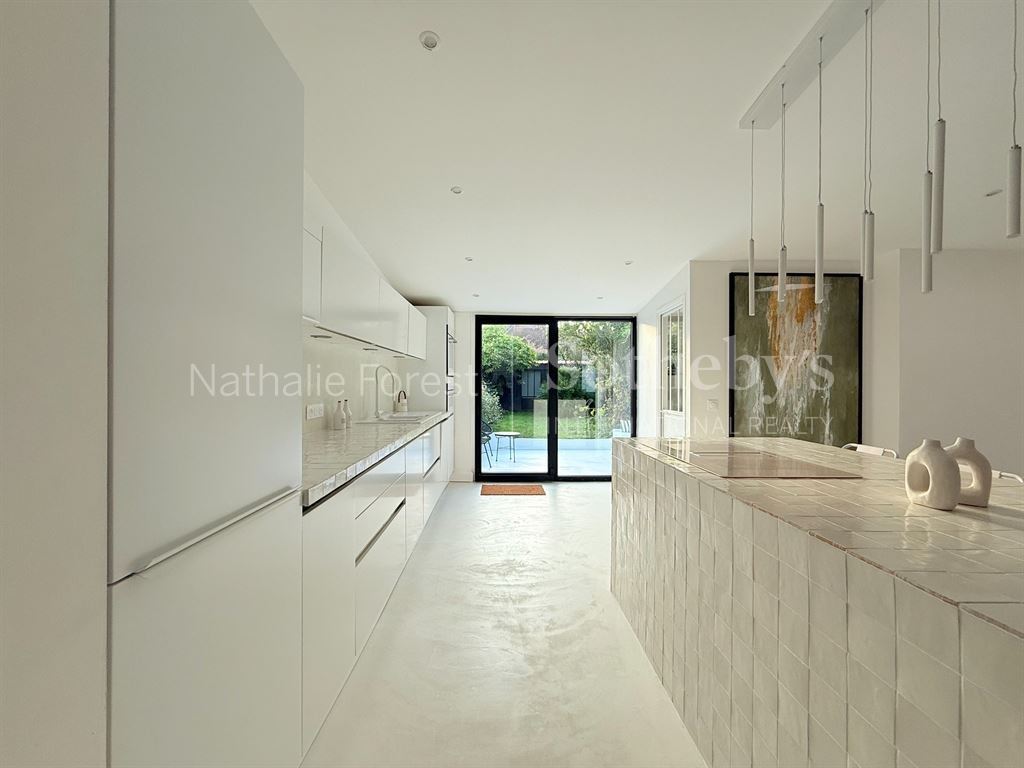 À l’extérieur, un joli jardin à l’abri des regards, agrémenté d’une terrasse en béton ciré, offre un espace paisible pour profiter des beaux jours.