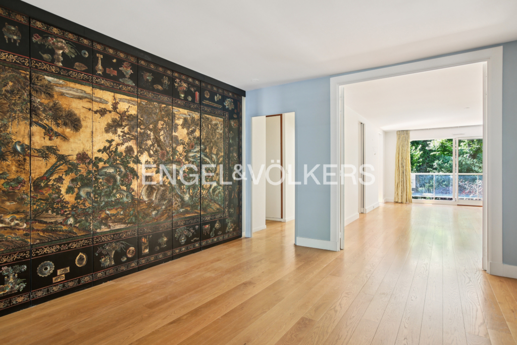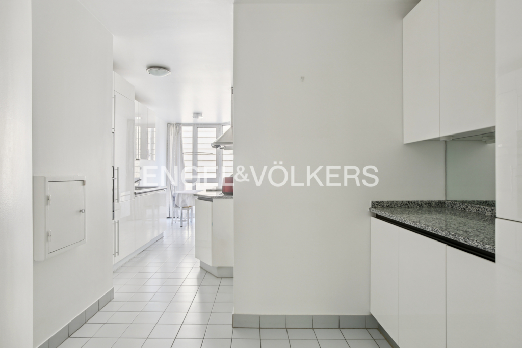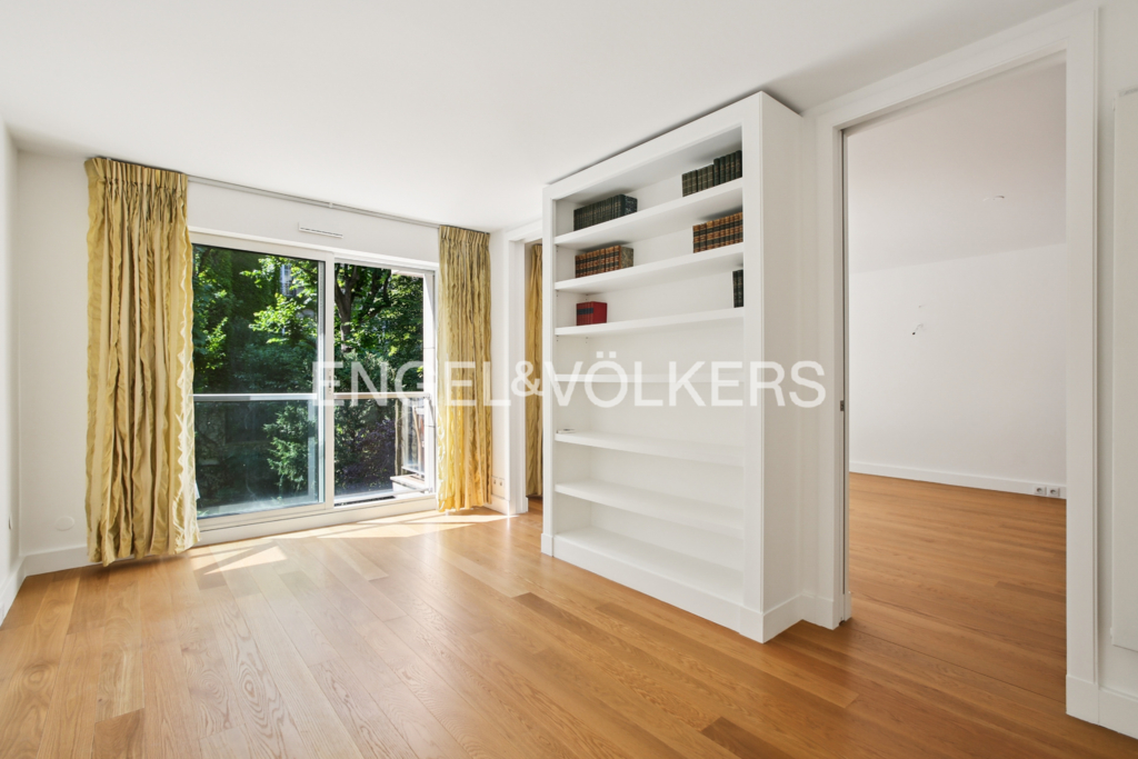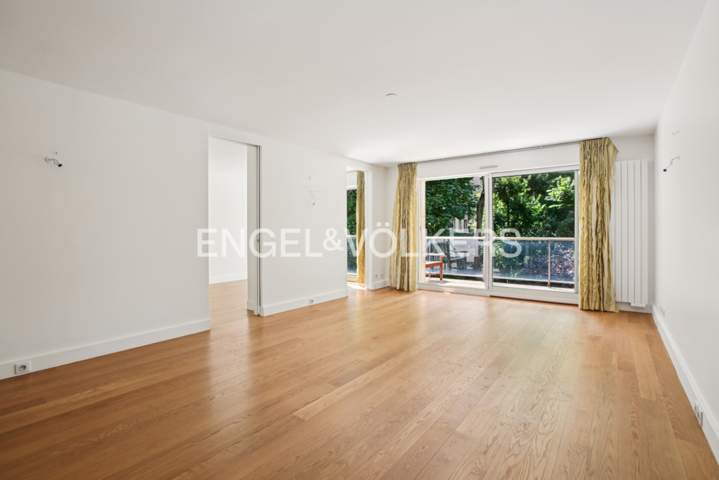La configuration de cet appartement comprend une vaste entrée, un spacieux séjour de 30 m² prolongé d'une terrasse exposée Ouest de 7.3 m² offrant une vue sur jardin, une cuisine dinatoire meublée et équipée avec espace office de 17m², une grande et belle chambre de maître de 25 m² en suite avec salle de bains et toilettes indépendantes. En addition, un petit salon de 15 m² où 2ème chambre vue jardin, un grand dressing, une 2ème salle de douche à l'italienne avec wc, un espace buanderie plus un débarras.