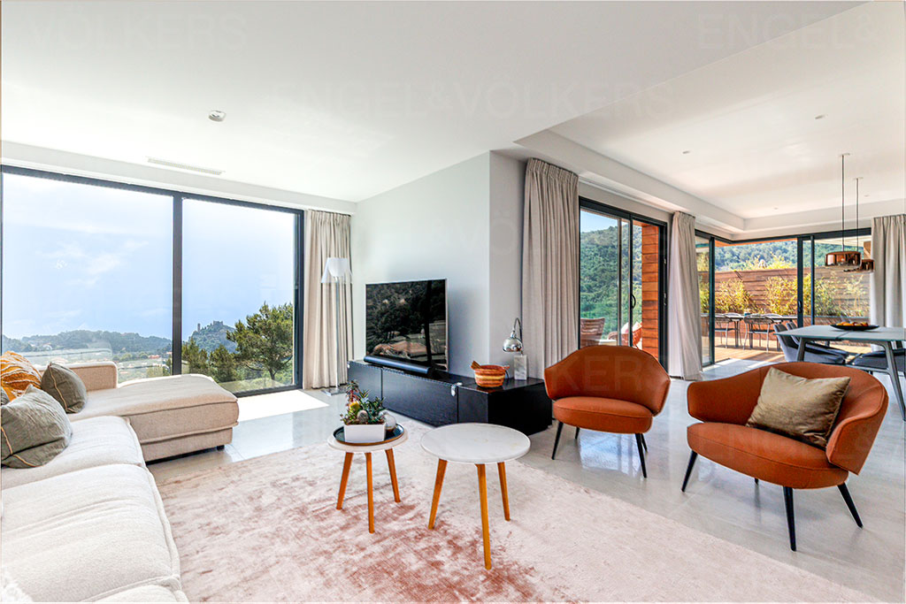 Située dans un quartier résidentiel, à seulement 10 minutes de Monaco, 15 minutes de Nice et 25 minutes de l'aéroport, magnifique propriété de style contemporain comprenant 205m2 de surface habitable, 190m2 de garage et 250m2 de terrasses incluant un toit terrasse de 93,5m2 avec vue mer panoramique.
