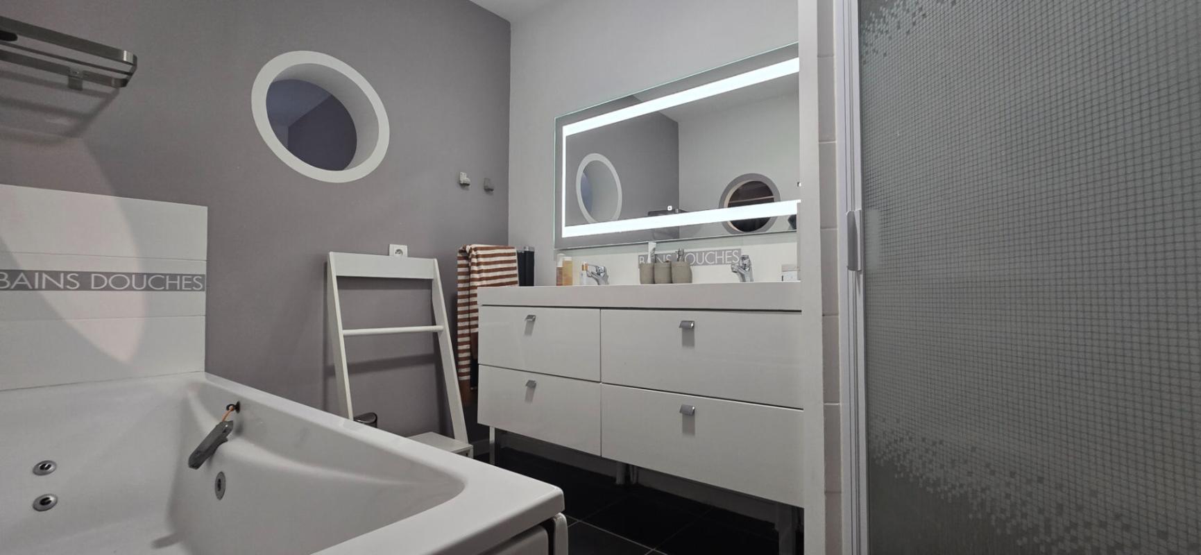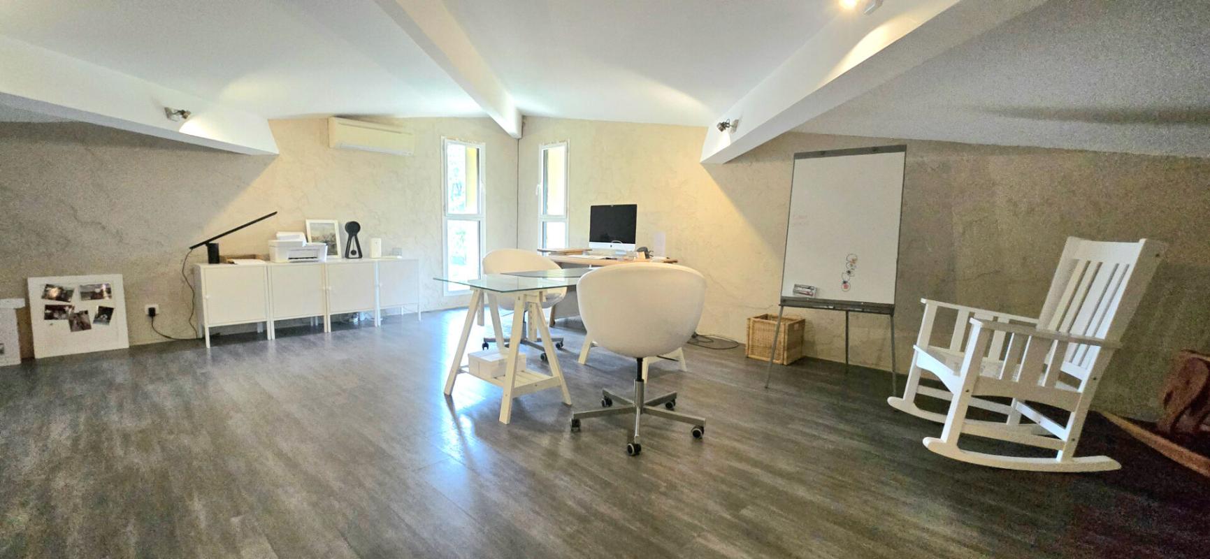 La pièce de vie spacieuse, baignée de lumière grâce à ses grandes baies vitrées traversantes, s'ouvre de part et d'autre sur deux terrasses sud/nord, sans vis-à-vis, offrant un cadre de vie chaleureux et harmonieux en parfaite connexion avec la nature. L'agencement intérieur a été soigneusement pensé avec une suite parentale disposant d'un dressing et d'une salle de bains /douches privative, deux autres chambres chacune dotée de leur propre salle d'eau, 2 wc, une buanderie et des combles aménagés qui accueillent un espace bureau idéal pour le télétravail ou une activité indépendante.