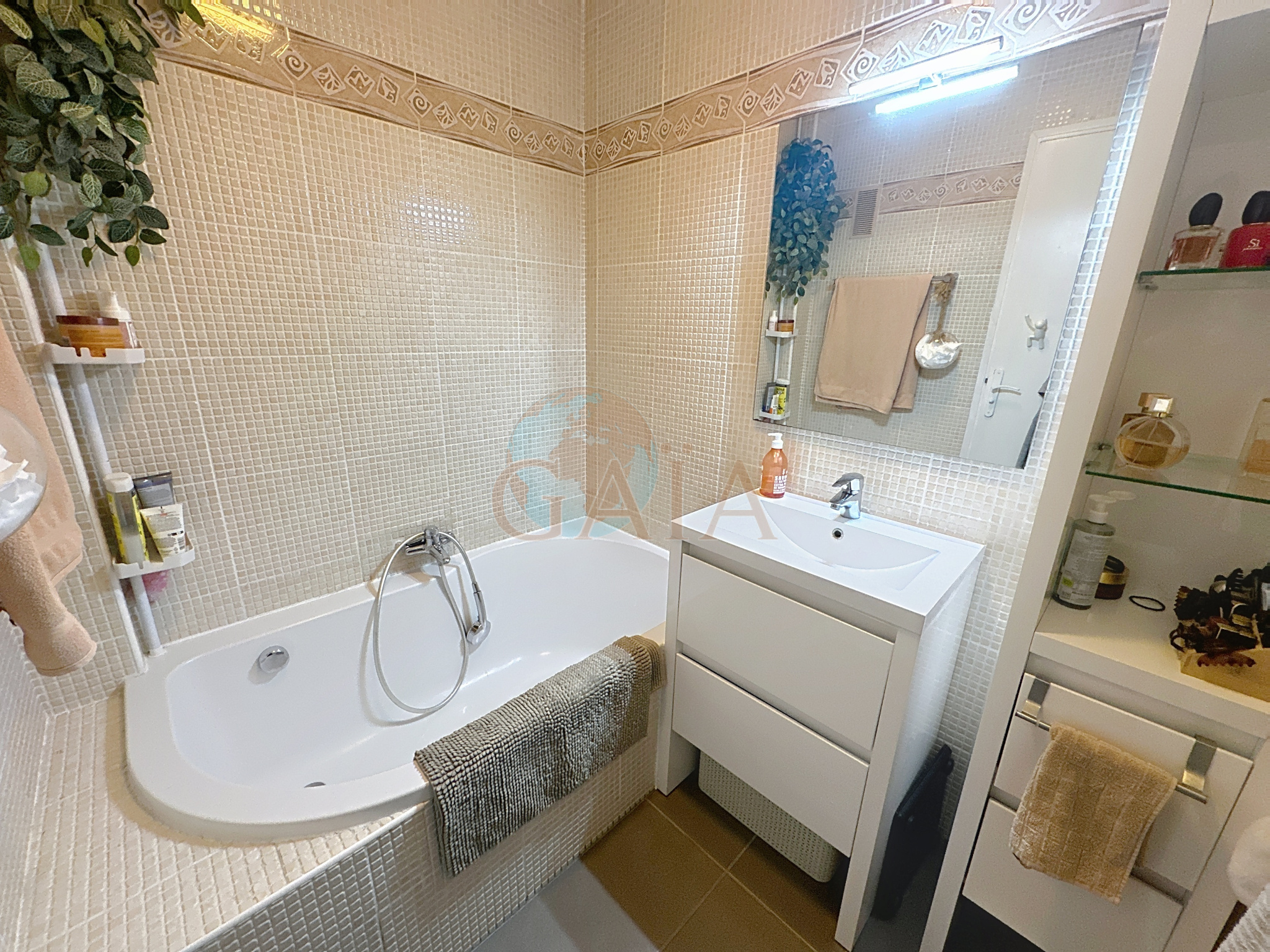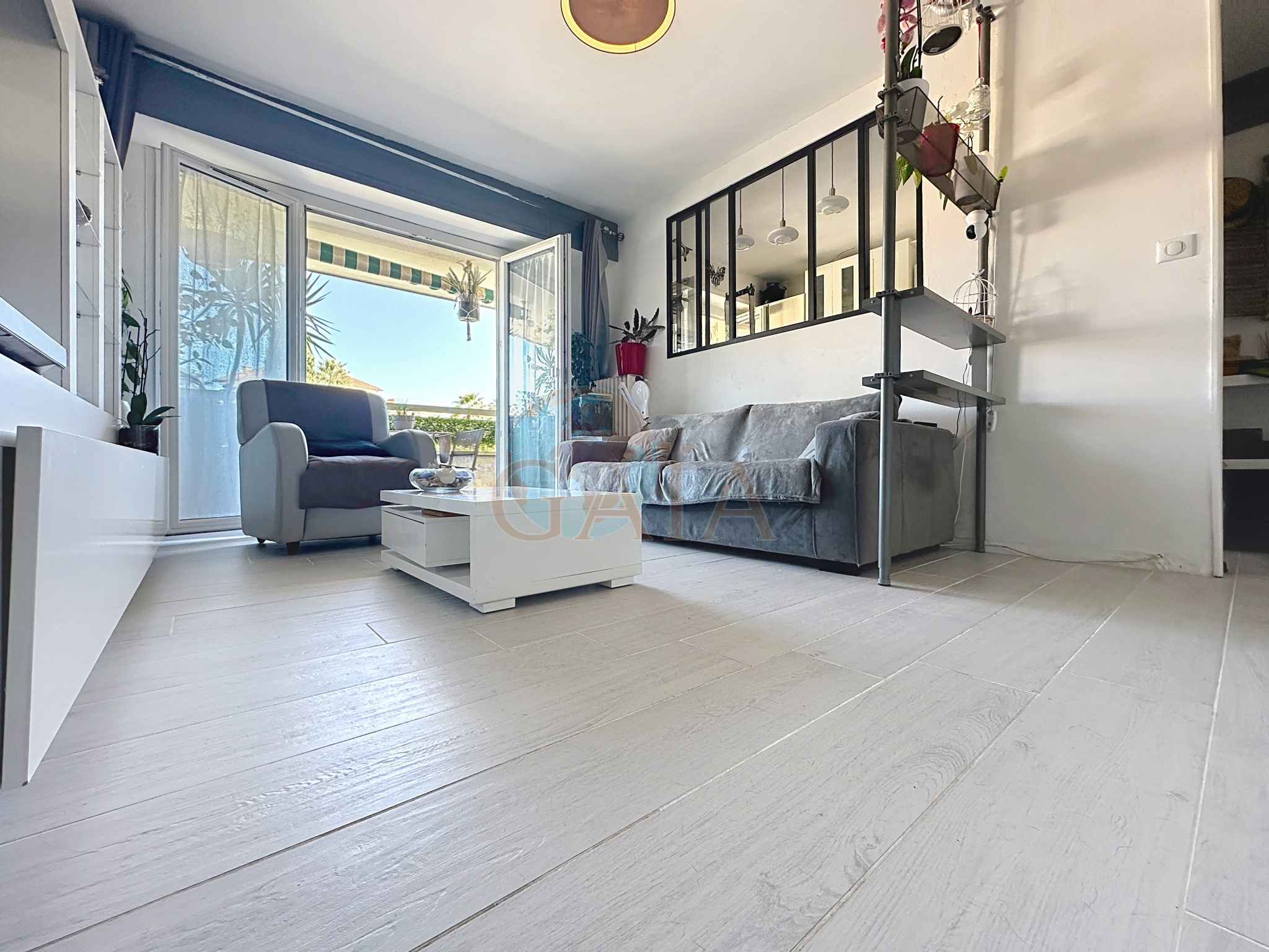 Il se compose d'une entrée desservant une cuisine ouverte sur le séjour, le tout donnant accès à une agréable terrasse de 7 m2 offrant une vue dégagée sur les collines, avec aperçu mer et îles de Lérins.