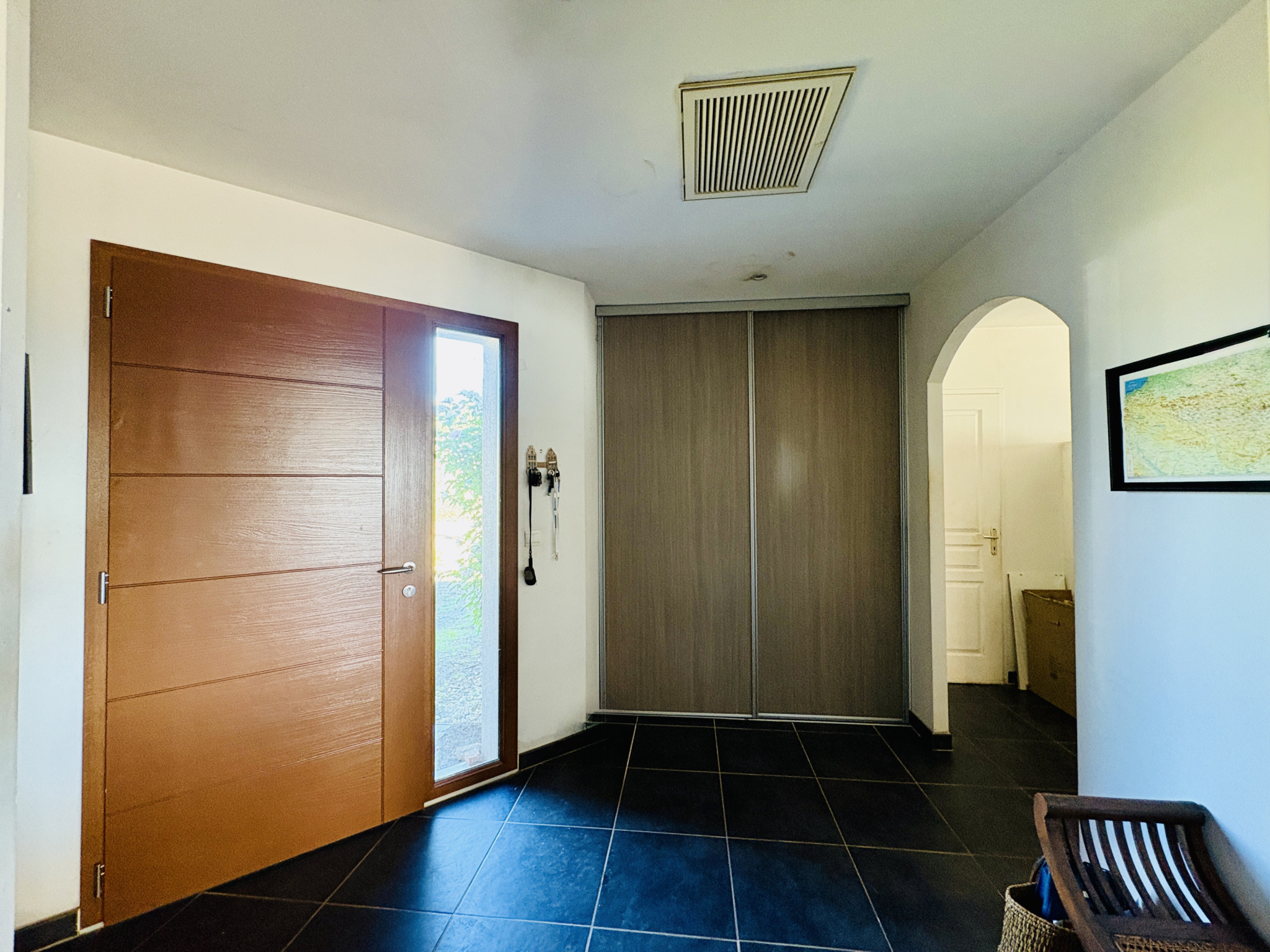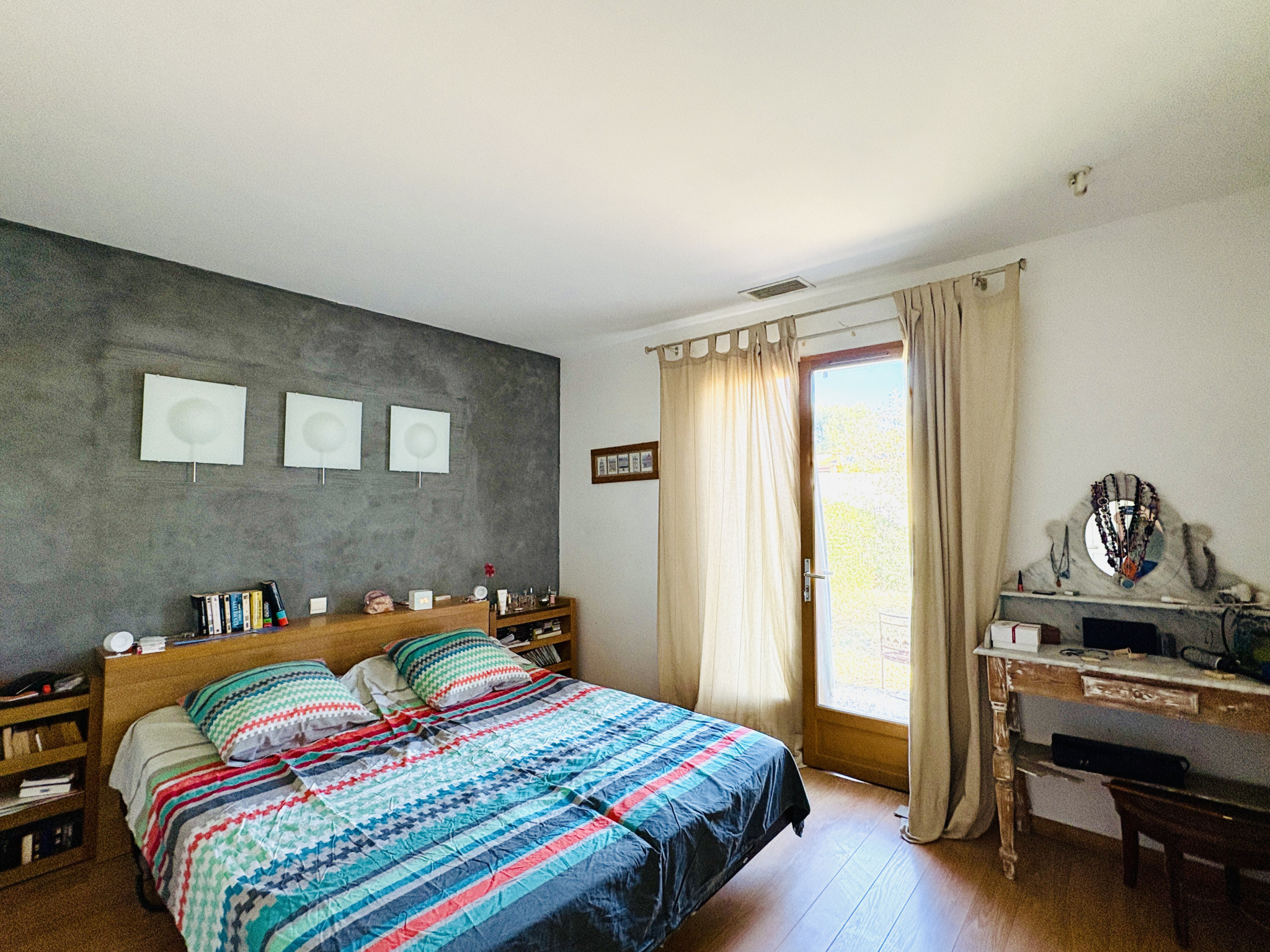 Proche de Carcassonne, belle villa de plain-pied de 160 m2 au calme orientée plein sud, avec grande terrasse et pergola, vue dégagée.La maison présente de beaux volumes, un grand salon séjour trés lumineux avec un poêle à bois, une cuisine équipée indépendante, un cellier, une buanderie, 3 chambres dont une chambre parentale et une autre avec salle d'eau.Bel espace piscine chauffée avec jardin arboré de 2000m2.