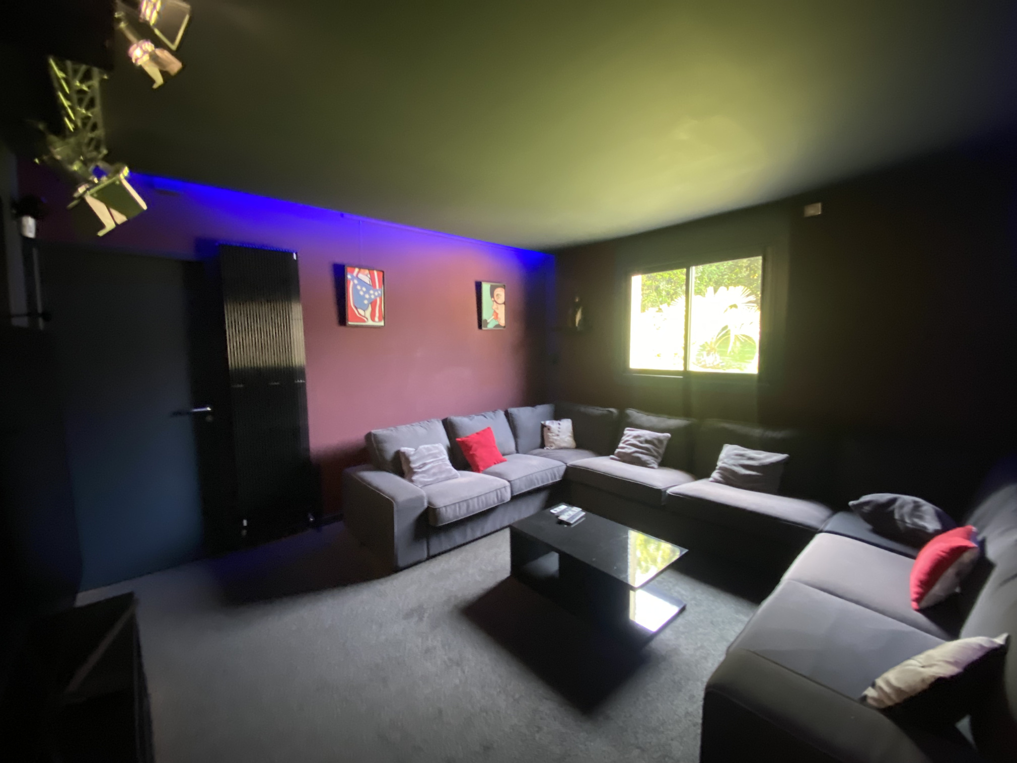 Elle se compose au rez-de-chaussé d'une grande pièce de vie de 69m2, d'une cuisine équipée, d'un bureau, d'une chambre avec salle d'eau et d'une salle cinema.