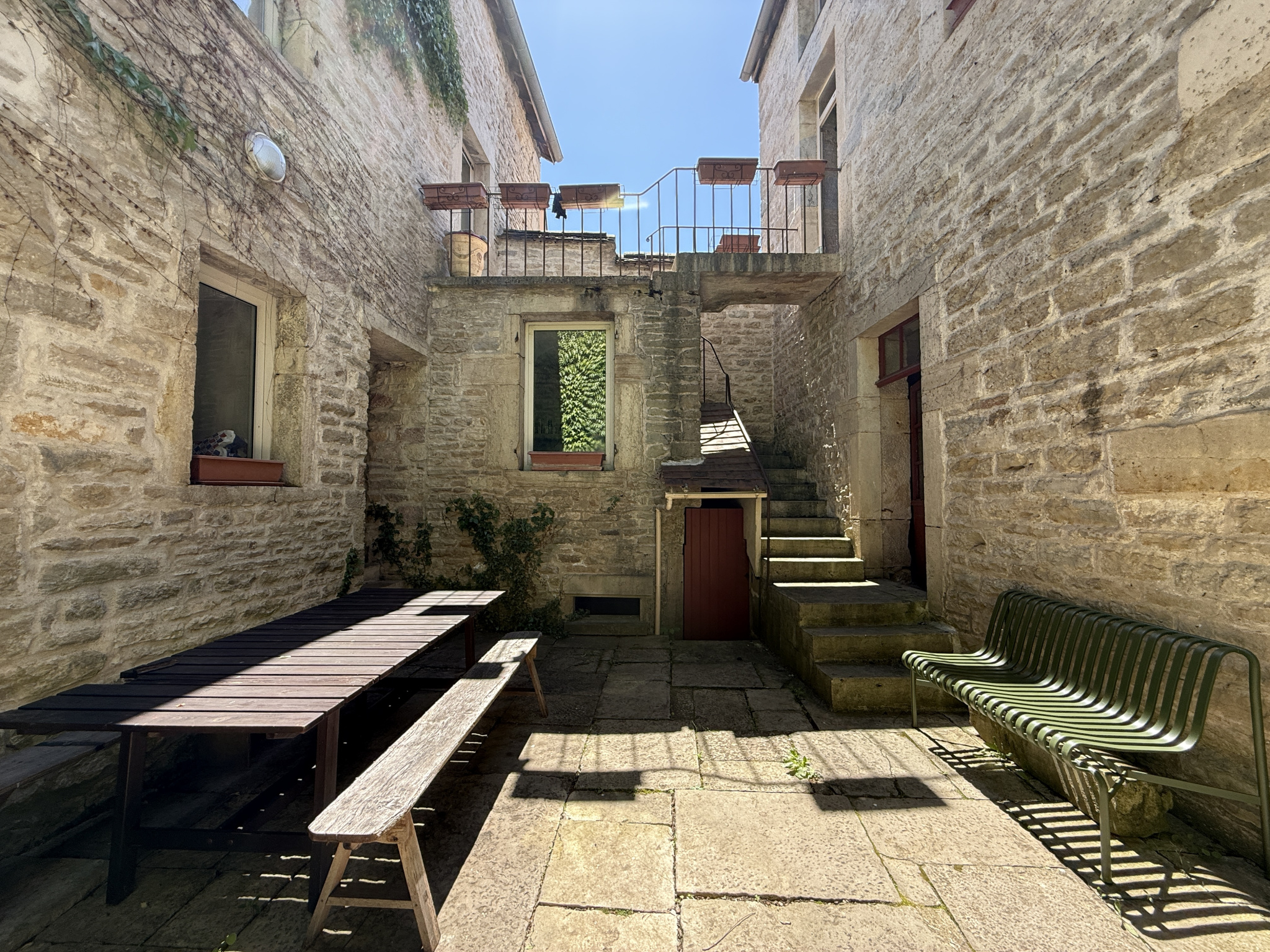 A VENDRE à PLOMBIERES-LES-DIJON 5 min Dijon Ouest, bus Divia. Bel ensemble immobilier fin XVIIIe, situé dans le coeur du village, proche de toutes commoditiés. Belle maison principale de 195m2, 5 chambres. Au RDC : Entrée, vaste pièce à vivre avec cheminée ouverte sur une cuisine équipée, office et cellier. Au 1er étage 2 chambres, salle de douche, salon traversant (plafond à la française, pierre apparente, bibliothèque). Au 2e étage : 3 chambres, bureau, lingerie et salle de douche avec WC. Maison annexe de 120m2 actuellement affectée à un usage professionnel. Au RDC grange et four à pain en parfait état de marche. 1er étage : séjour-cuisine, 2 bureaux, chambre, salle-de-douche, WC.Grenier. Très beau potentiel. IDEAL ARTISAN OU PROFESSION LIBERALE Beaucoup de cachet. Parking pour 2 voitures sous un porche, 2 caves. Cour en dalles de Bourgogne.