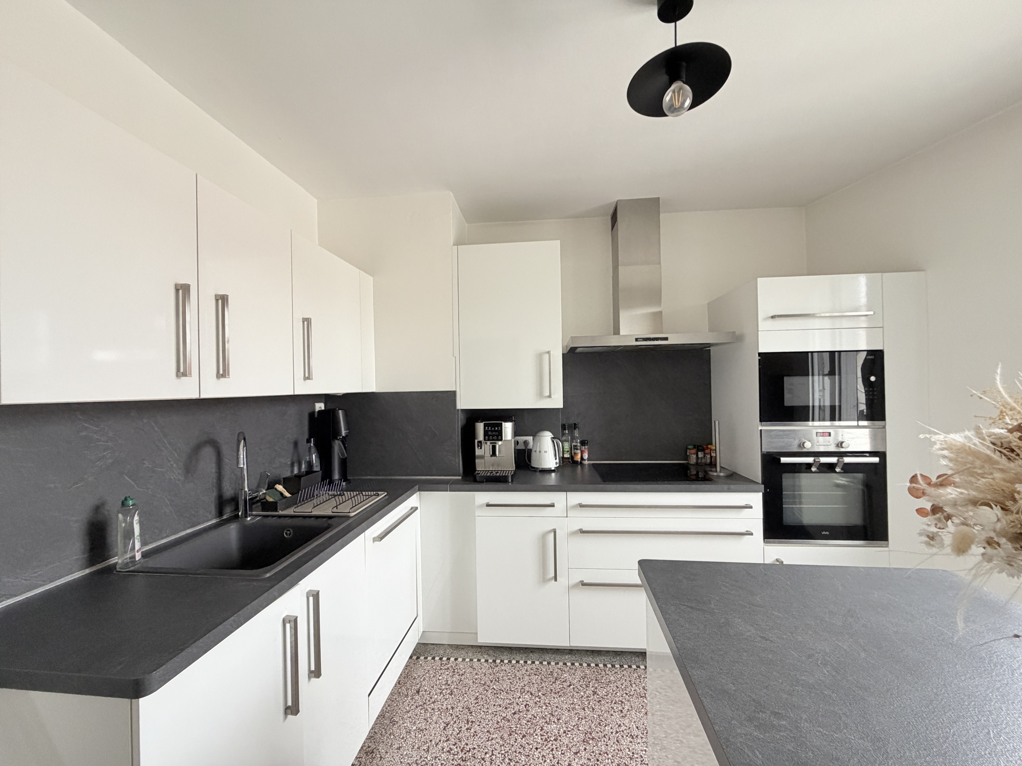 Elle s'ouvre sur un placard intégré et mène vers une cuisine moderne, entièrement aménagée et équipée, idéale pour les amateurs de convivialité.