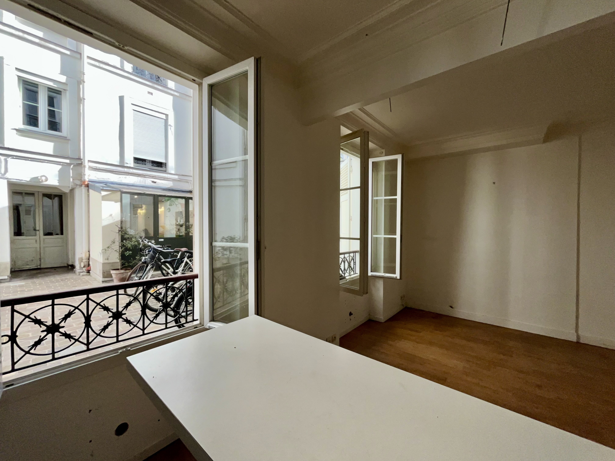 PARIS 17 BATIGNOLLES Appartement de 3 pièces traversant, d'une superficie de 47,03m2 au rez-de-chaussée sur cour au calme, composé d'une entrée, cuisine ouverte sur séjour totalisant 19,50m2 éclairés par deux fenêtres, orienté EST, une chambre de 11,95m2, un bureau de 7,27m2, salle de bains avec WC.