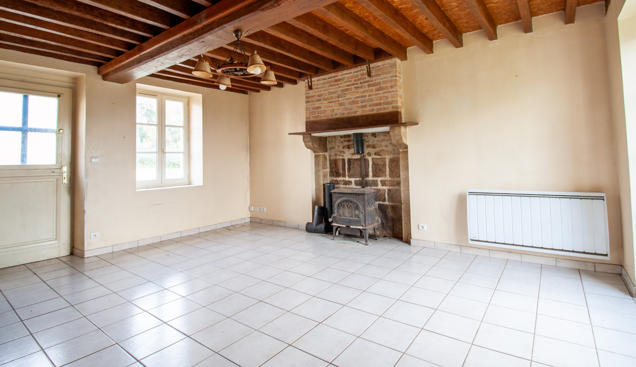 Vous découvrirez une agréable pièce de vie lumineuse dotée d'un poêle à bois, parfaite pour réchauffer vos soirées d'hiver et créer une atmosphère conviviale. La cuisine indépendante, fonctionnelle et spacieuse, permet de cuisiner en toute tranquillité. Une salle d'eau et des toilettes séparées complètent ce niveau.