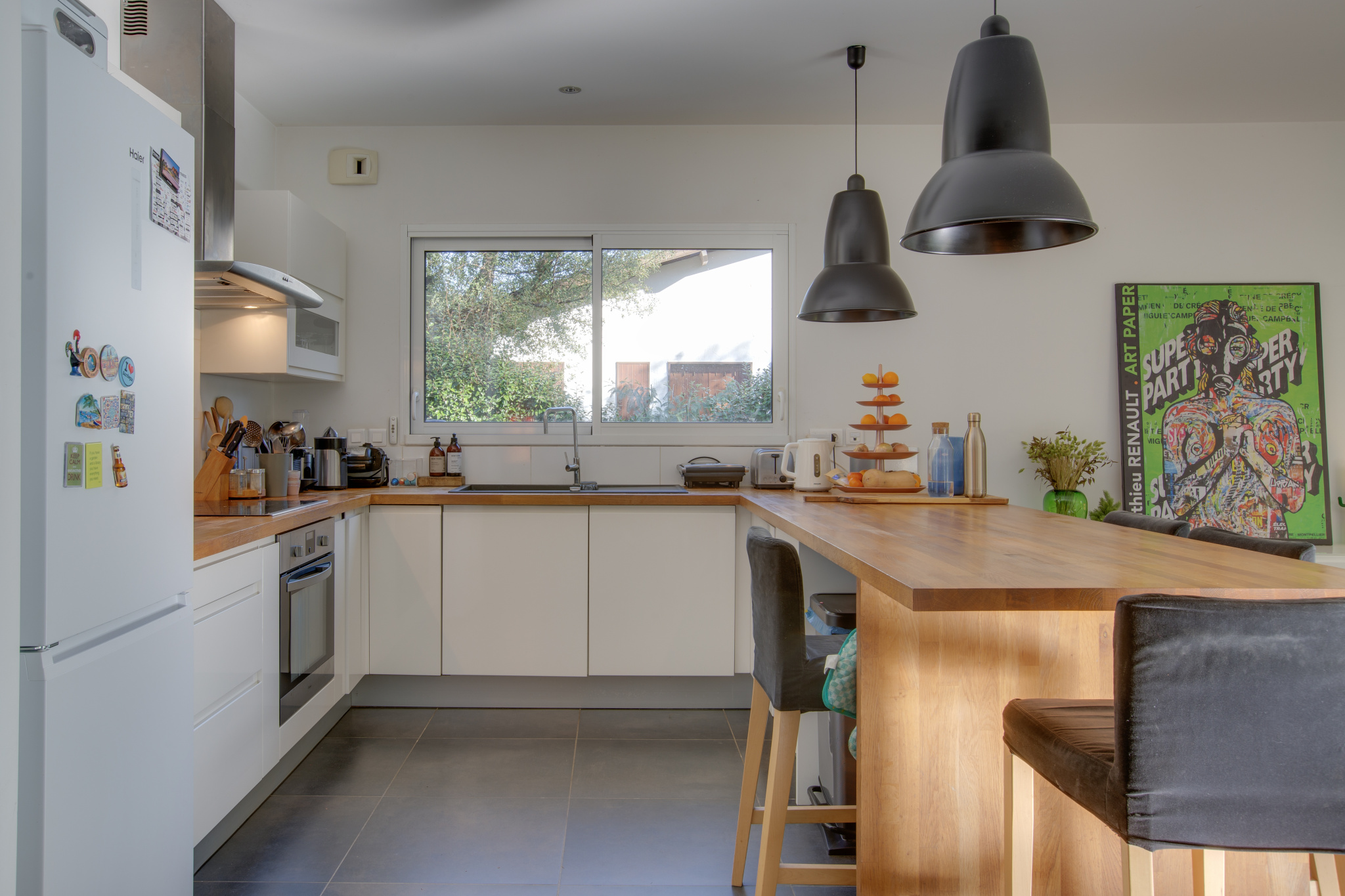 Au rez-de-chaussée, une vaste pièce de vie lumineuse avec cuisine ouverte s'ouvre sur la terrasse et la piscine. Vous y trouverez également une suite parentale avec salle d'eau et dressing, un WC indépendant, ainsi qu'un garage/buanderie.