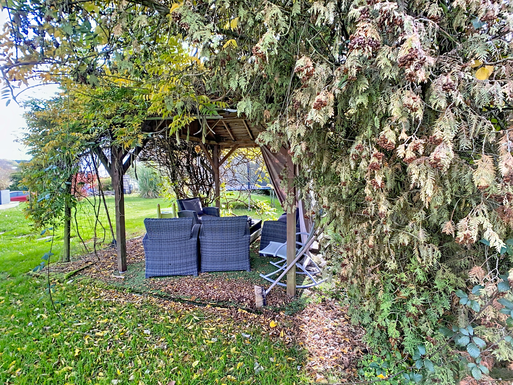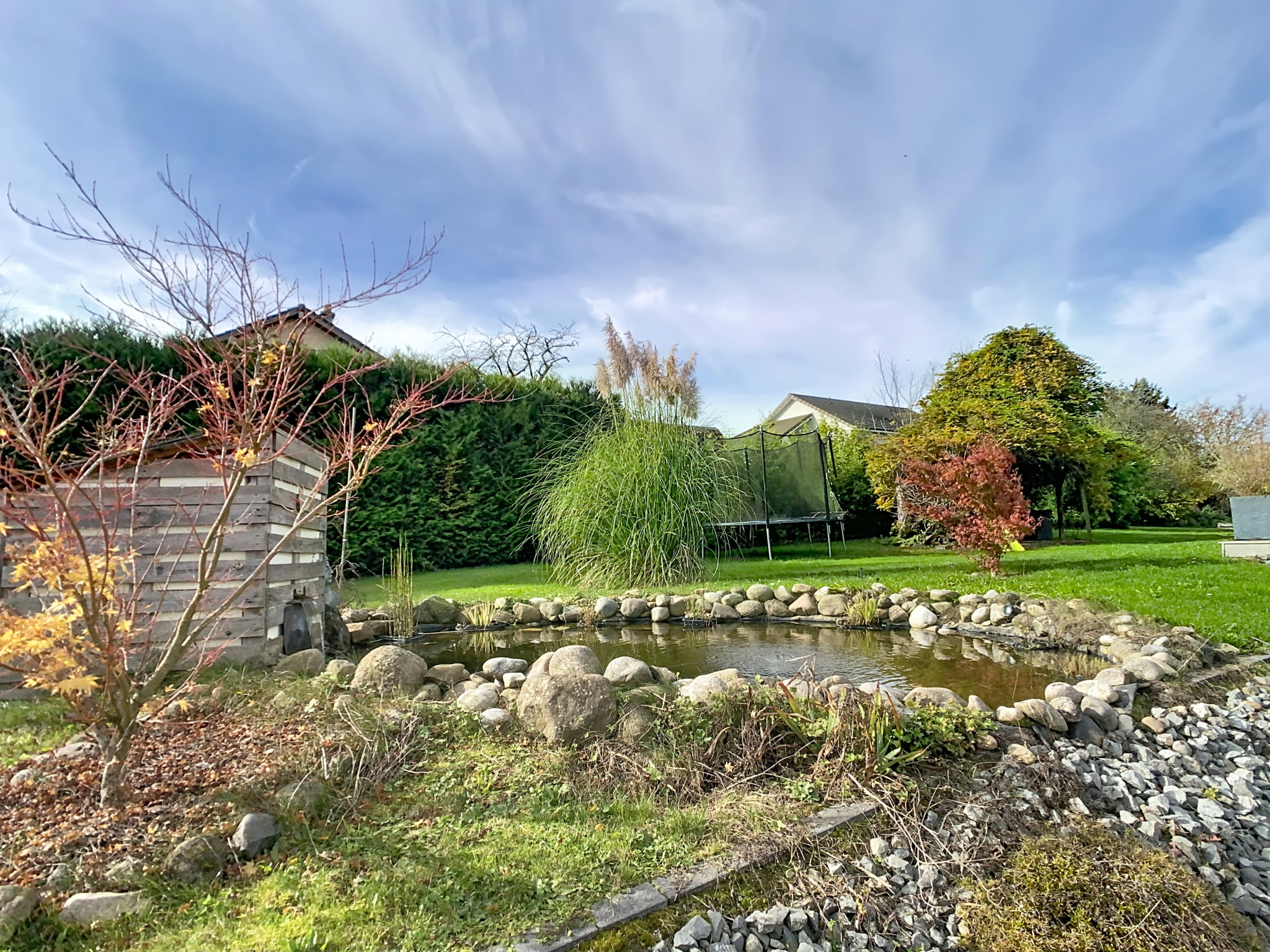 Un terrain partiellement paysagé avec bassin, piscine semi-enterrée, pergola naturelle, le reste conservé en nature, pour profiter du calme et de la verdure