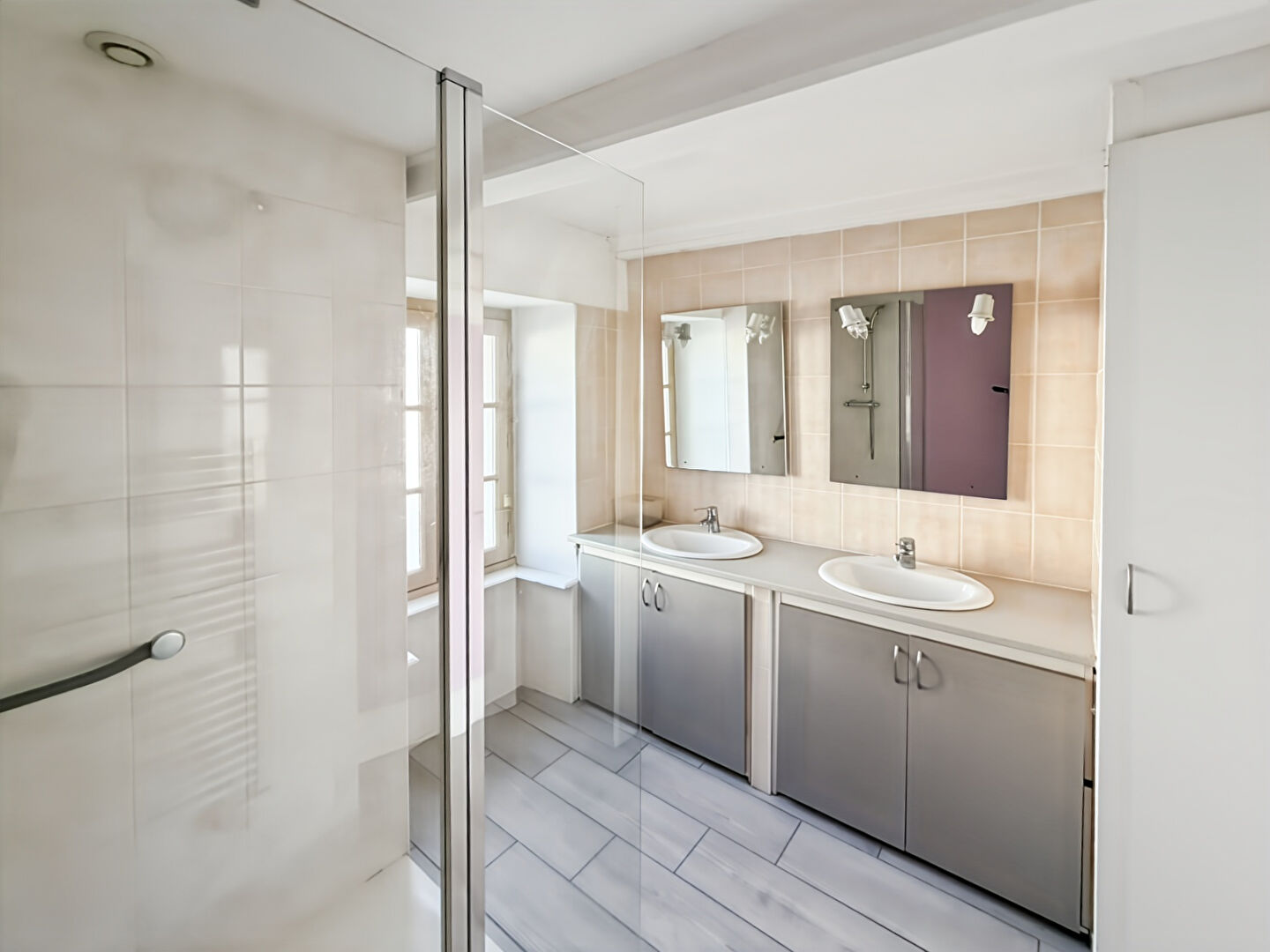 Le premier étage se compose de deux chambres spacieuses, d'une salle de bain rénovée avec double vasque et douche à l'italienne, et d'un second WC séparé.