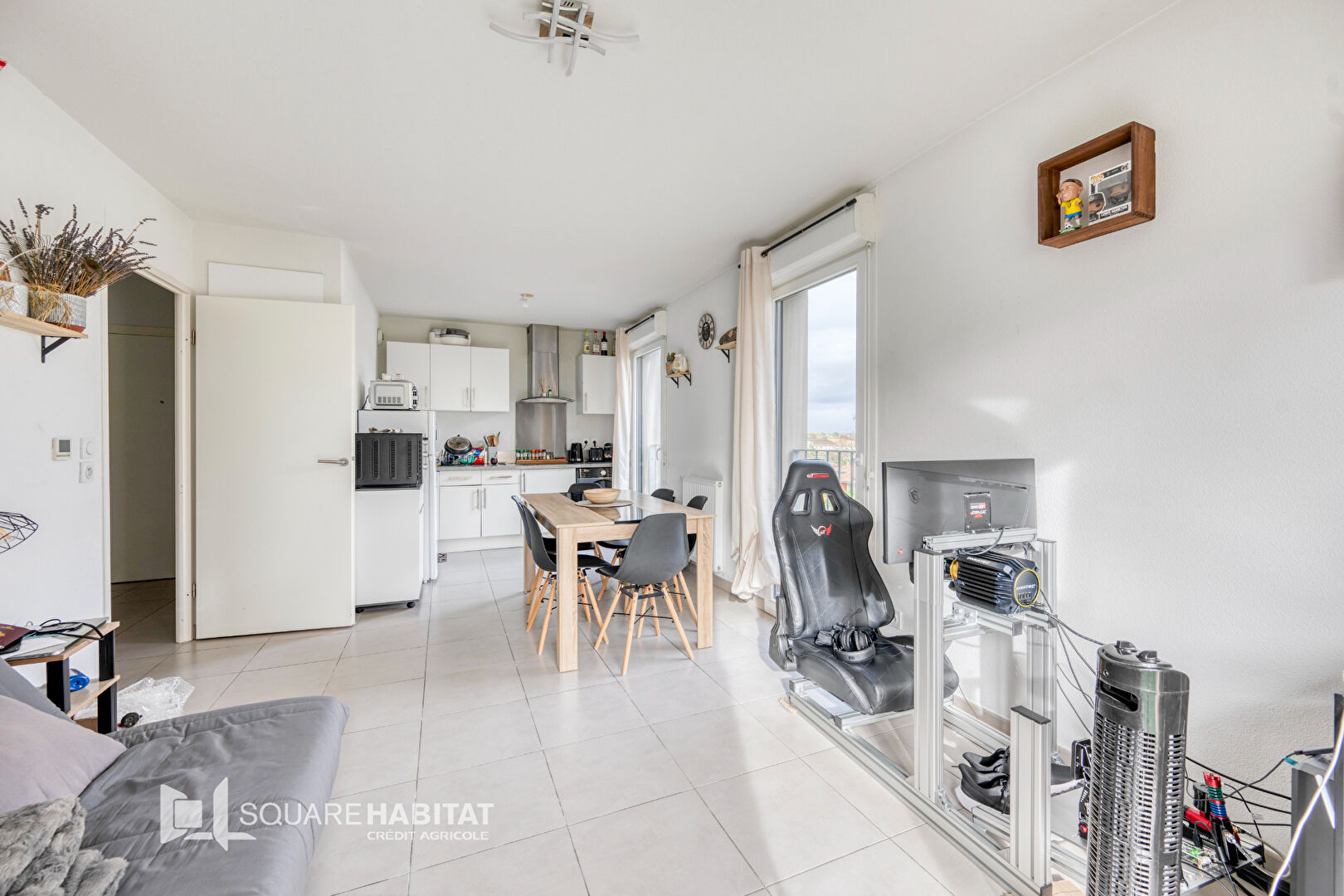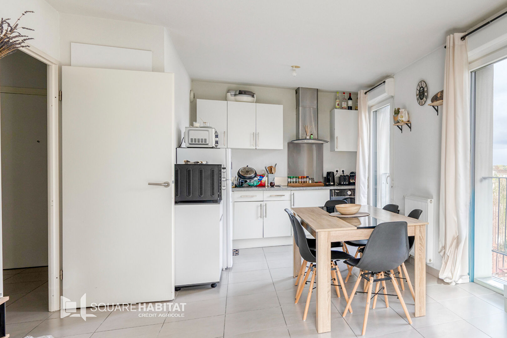 d'une entrée desservant une pièce de vie lumineuse avec cuisine aménagée et équipée,
