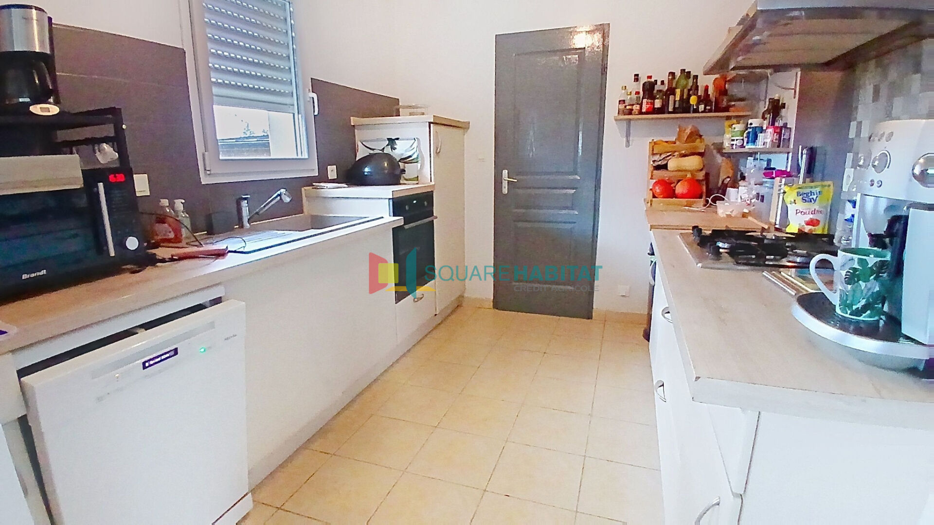 Elle se compose au rez-de chaussée d'un séjour salon de 60 m2, équipé d'un poêle à pellets, espace cuisine aménagée et équipée, une chambre avec salle d'eau privative, WC et buanderie de 15m2
