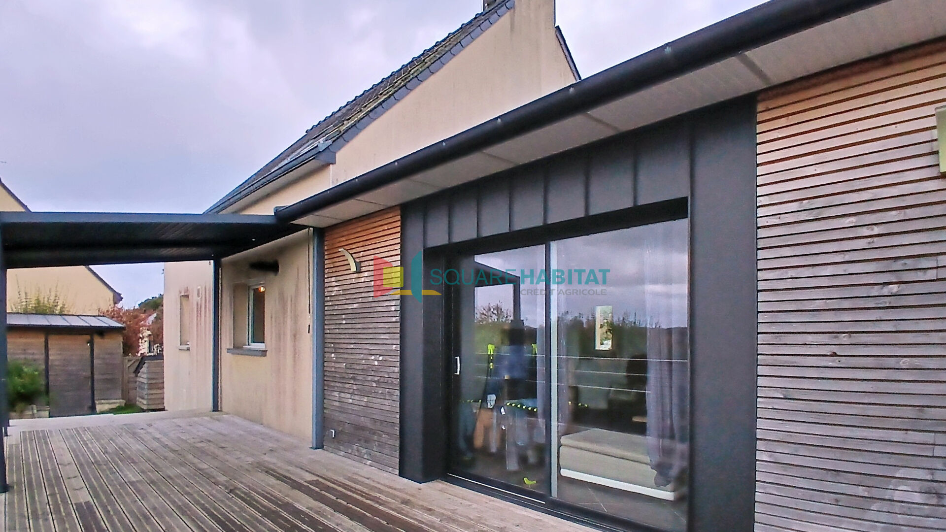 Cette maison présente 2 terrasses en bois dont l'une, exposée Ouest, directement accessible du salon, équipée d'une pergola et offrant une belle vue dégagée