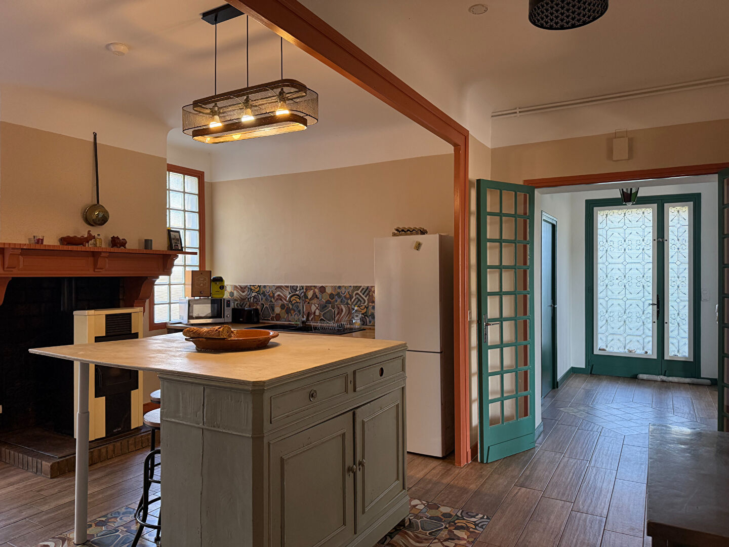 Le rez-de-chaussée offre un vaste séjour baigné de lumière grâce à son exposition plein Sud, une grande cuisine familiale avec arrière-cuisine à rénover, une chambre et une salle d'eau.