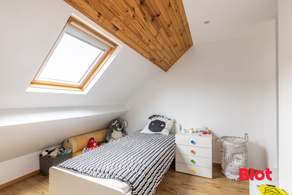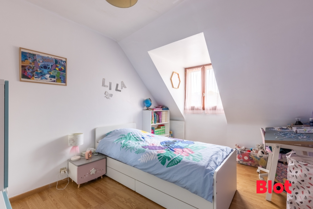 A l'étage, deux belle chambres lumineuses et une troisième chambre avec un grand dressing, un bureau une salle d'eau avec WC, un dégagement et un grenier offrant un espace de rangement supplémentaire.
