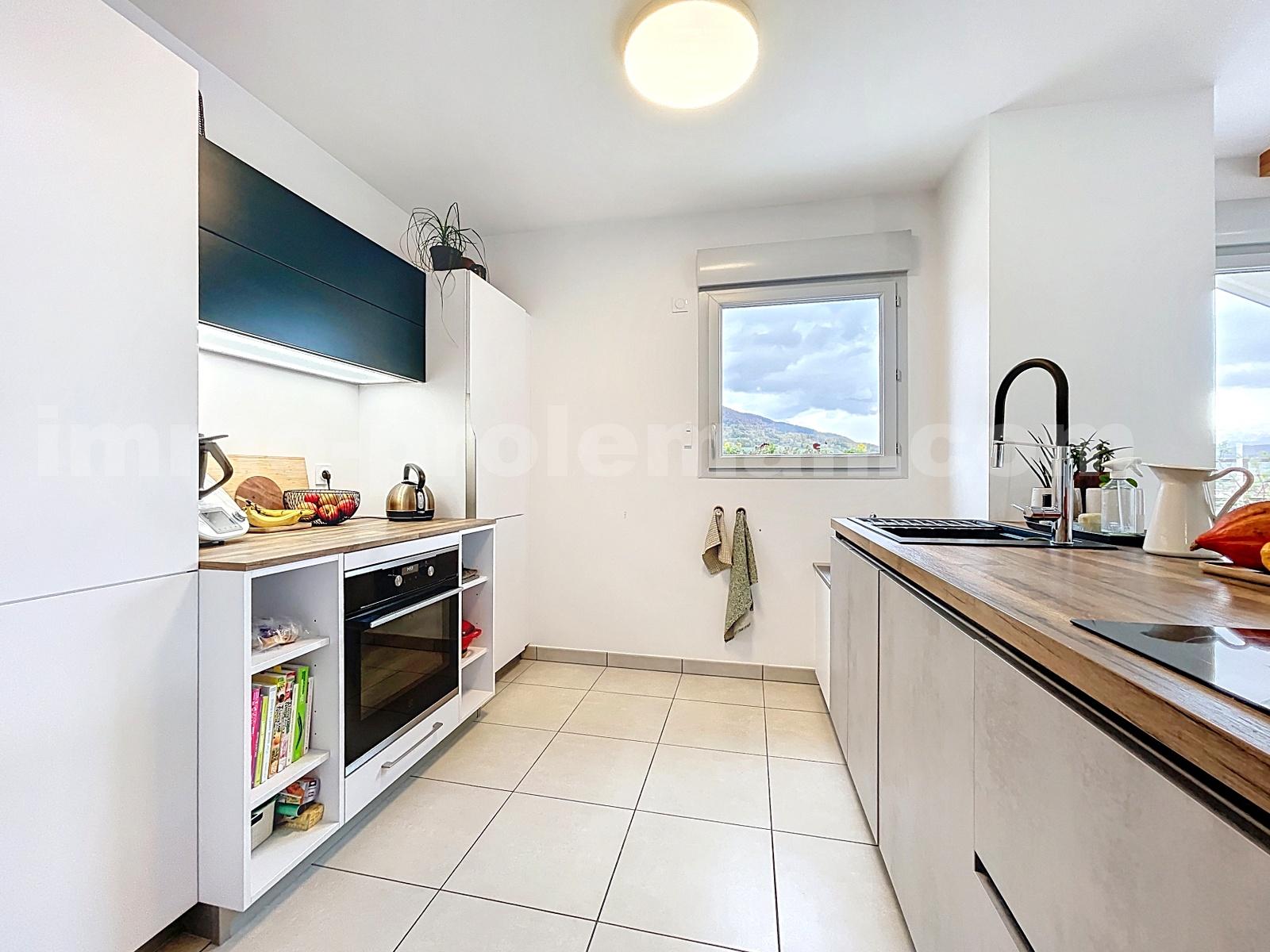 La cuisine américaine entièrement équipée s'ouvre sur un vaste séjour baigné de lumière, donnant accès à deux magnifiques terrasses : l'une de 45 m² avec le soleil du matin, avec vue panoramique sur les voirons, le Môle, le Mont-Blanc sans vis-à-vis, idéale pour profiter pleinement de l'extérieur, et l'autre de 9 m² exposée sud.