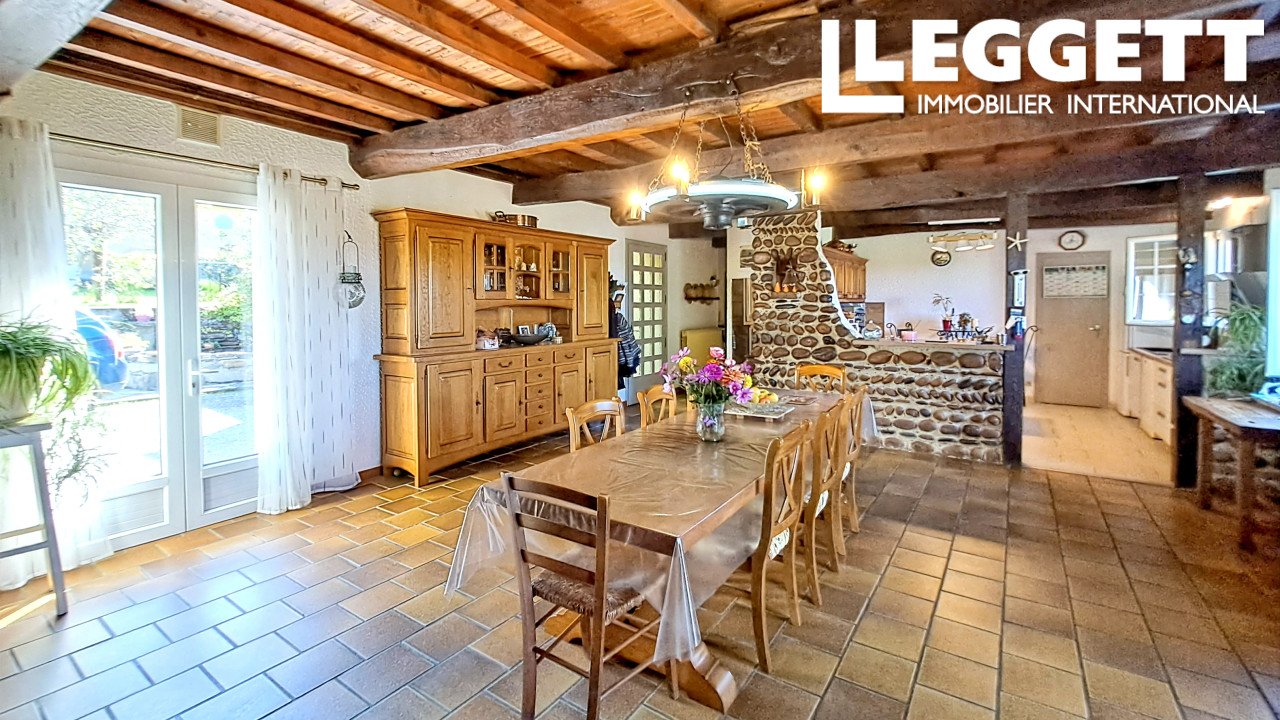 La maison principale, avec 276 m² habitables, offre 3 chambres, 2 salles de bain, un joli salon, une salle à manger/salon lumineux avec insert cheminée et une cuisine ouverte sur une grande terrasse idéale pour la vie en extérieur.