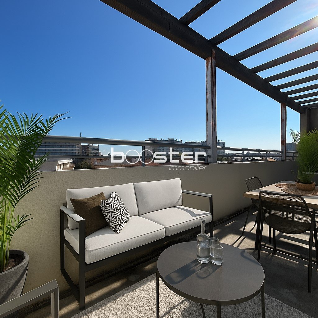 L'appartement offre un séjour lumineux avec une cuisine ouverte donnant sur une spacieuse terrasse de 20 m².