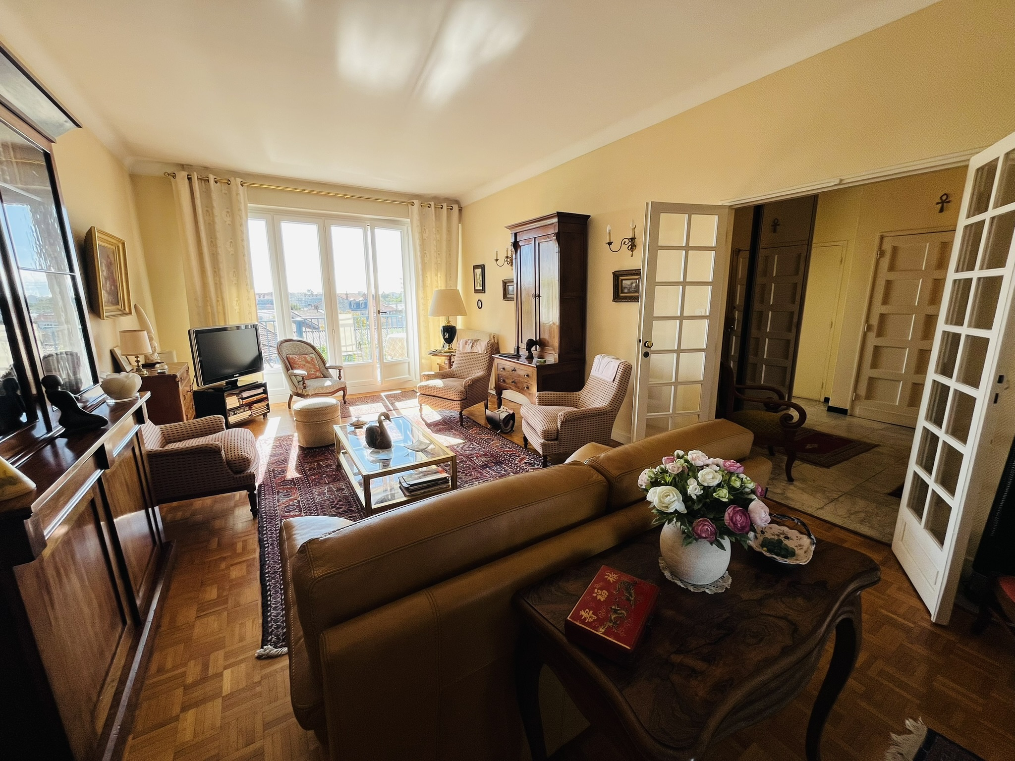 L'espace intérieur se compose d'un vaste salon séjour traversant avec cheminée et deux balcons, large entrée avec placards, trois chambres, dont une avec salle d'eau wc, une cuisine équipée, seconde salle d'eau et second wc indépendant.,