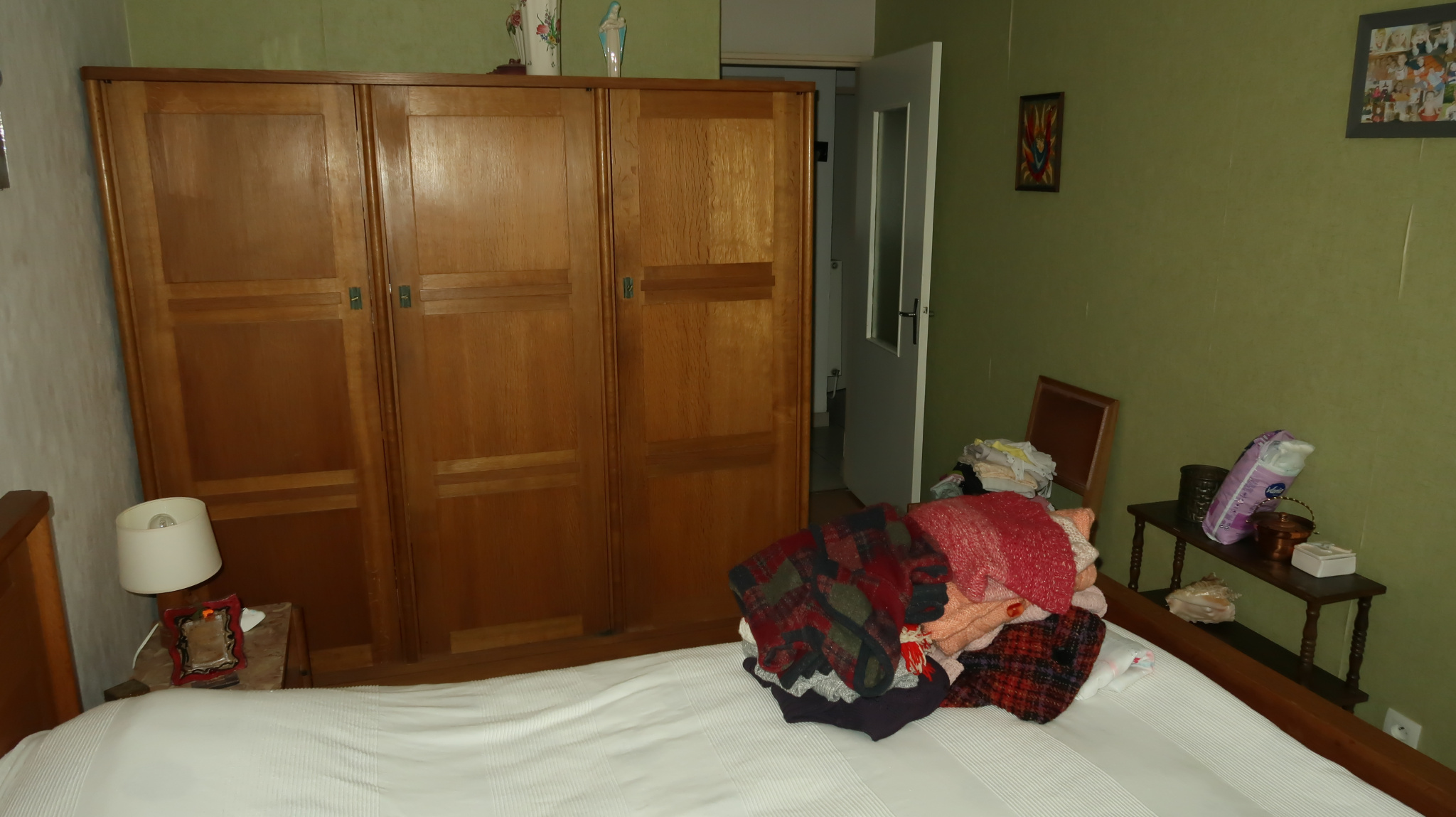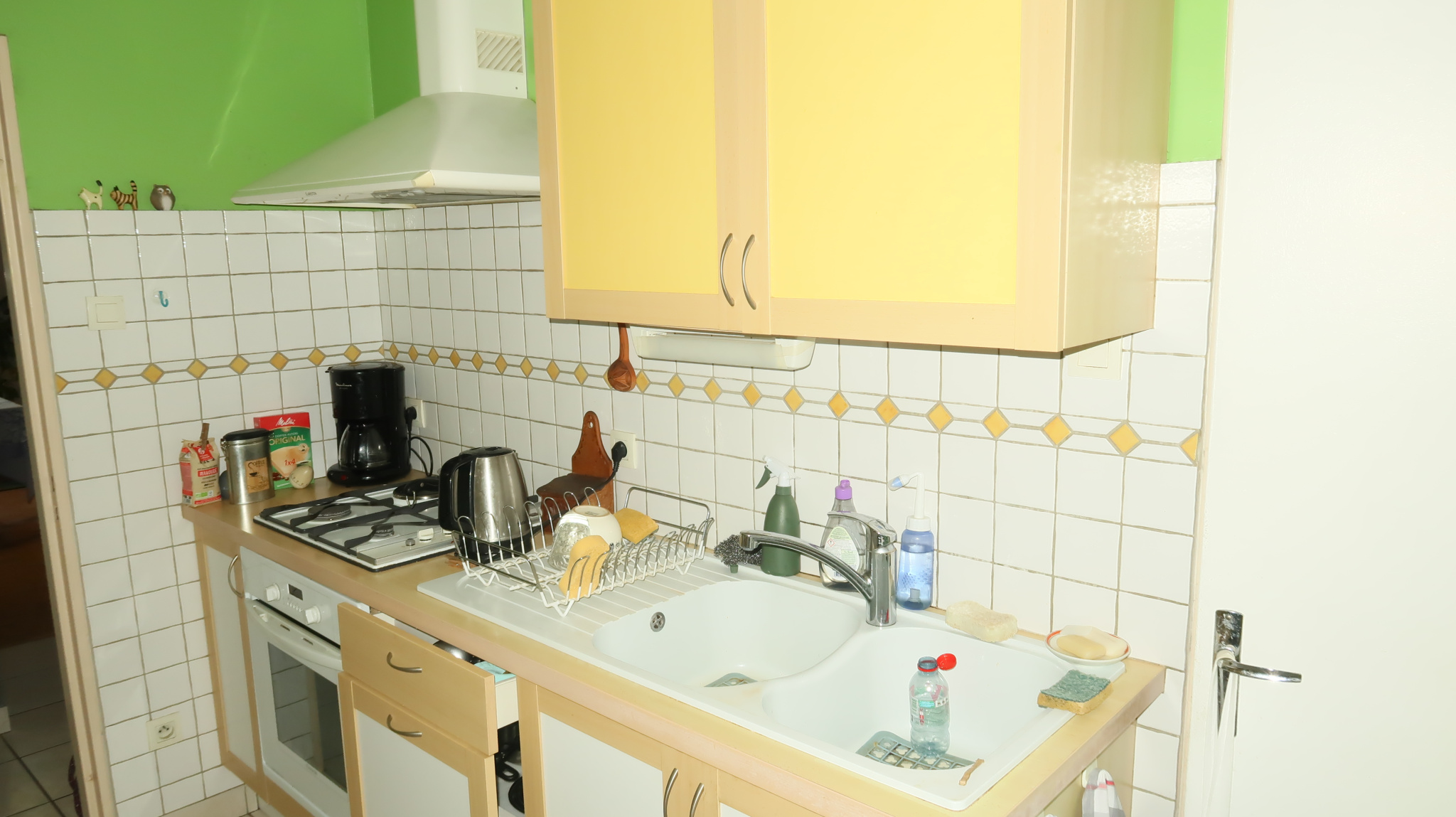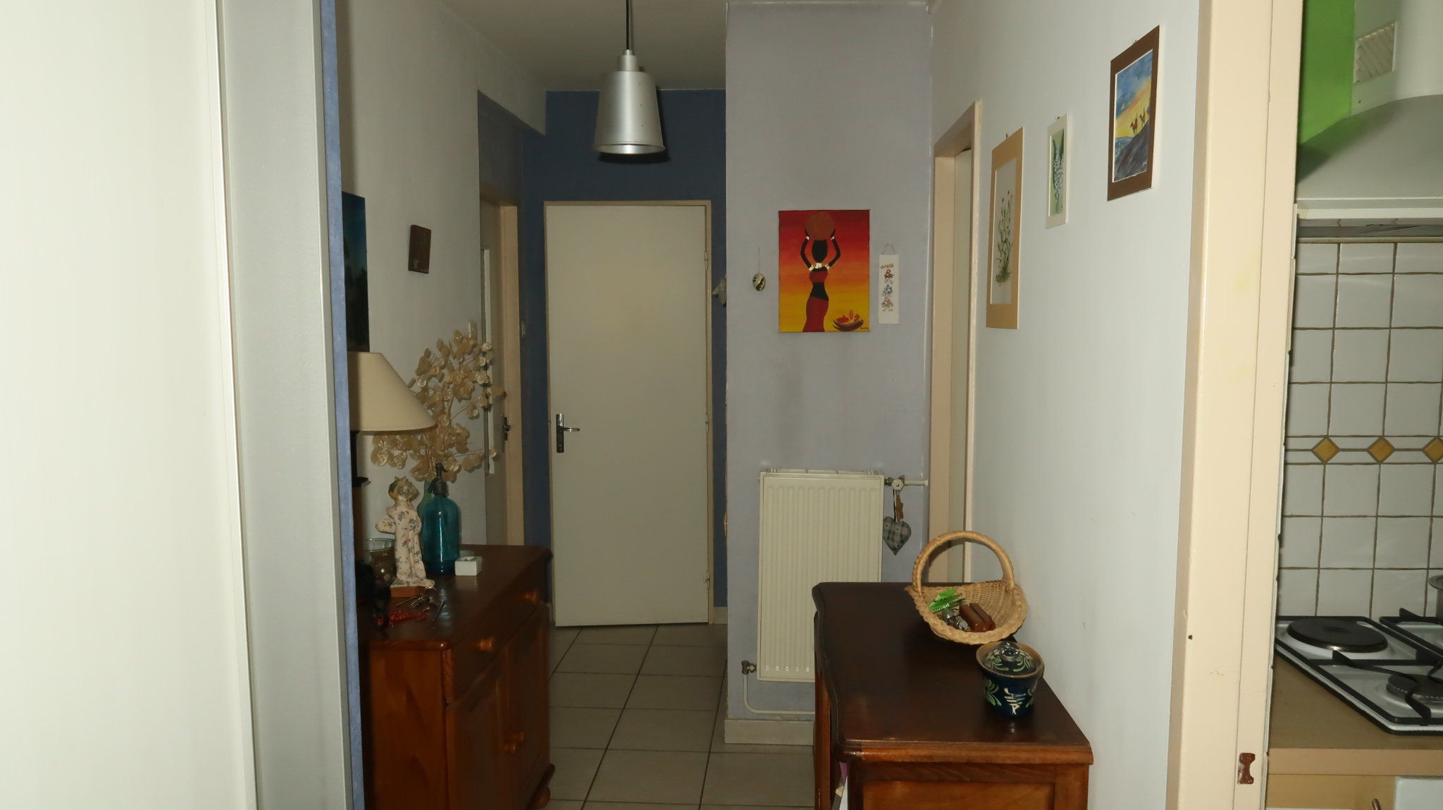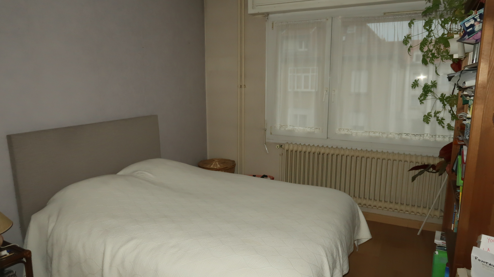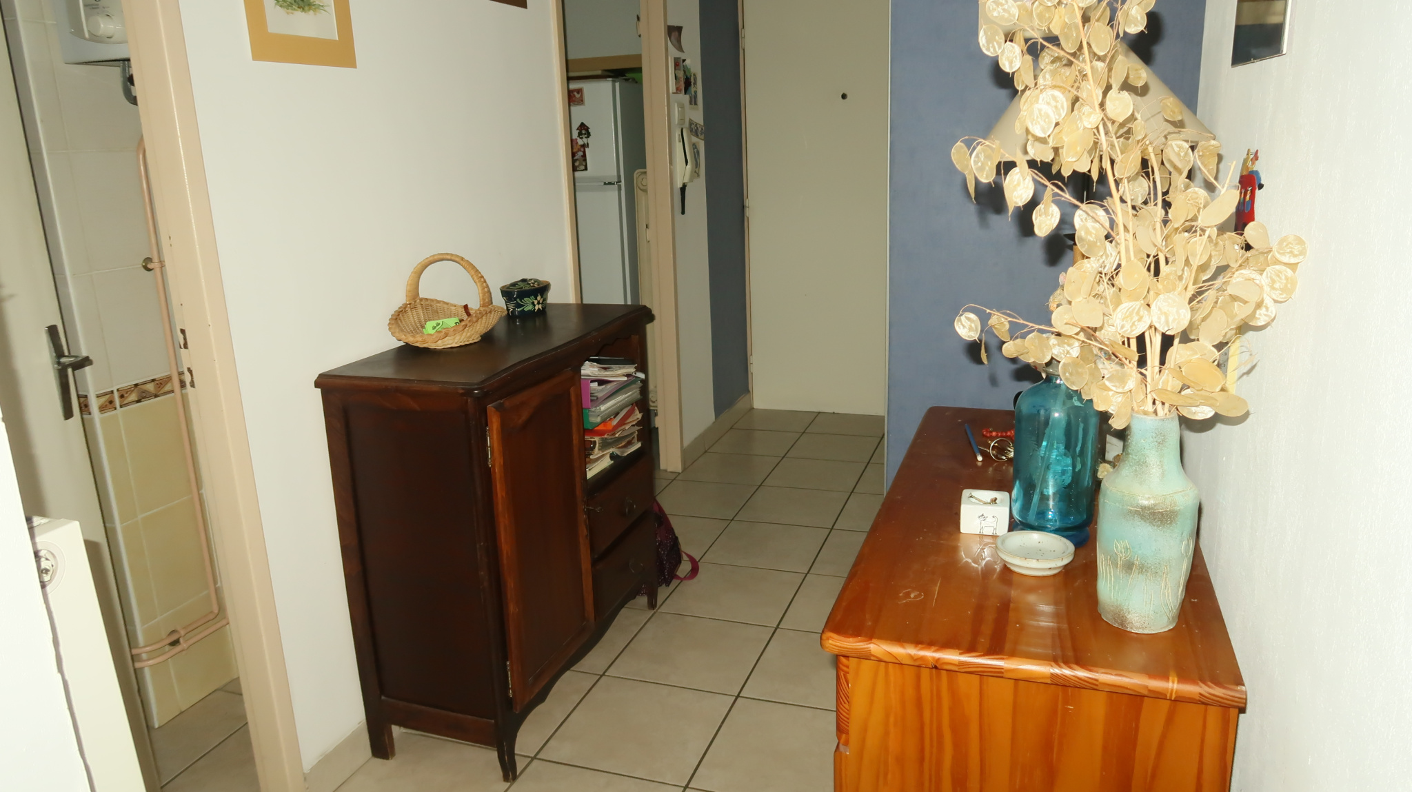 une entrée avec placard, beau dégagement distribuant : cuisine (10m2) avec cellier, séjour (25 m2) avec balcon, chambre côté rue (12 m2), chambre (10.5 m2) côté cour, salle d'eau, WC.
