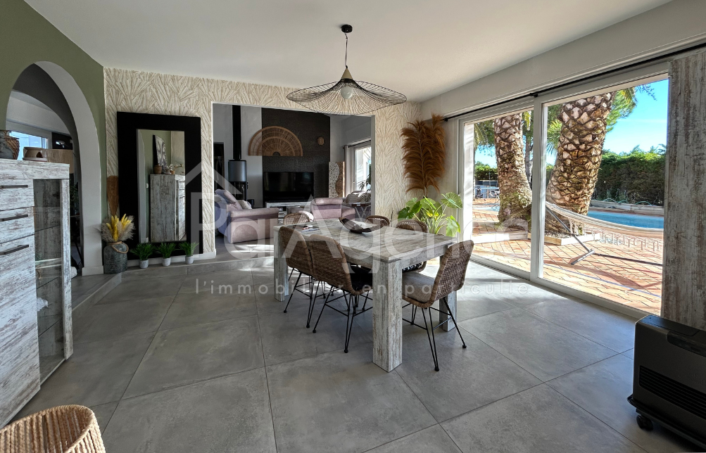 L'entrée dessert un salon généreux avec salle à manger attenante et cuisine américaine entièrement équipée (65 m2), ouverte sur terrasse et jardin avec vue sur la piscine. Une arrière-cuisine complète l'espace. La suite parentale dispose d'un dressing, d'une douche à l'italienne et d'une baignoire. Une chambre avec placard, dressing et salle d'eau avec douche à l'italienne ainsi que deux WC.
