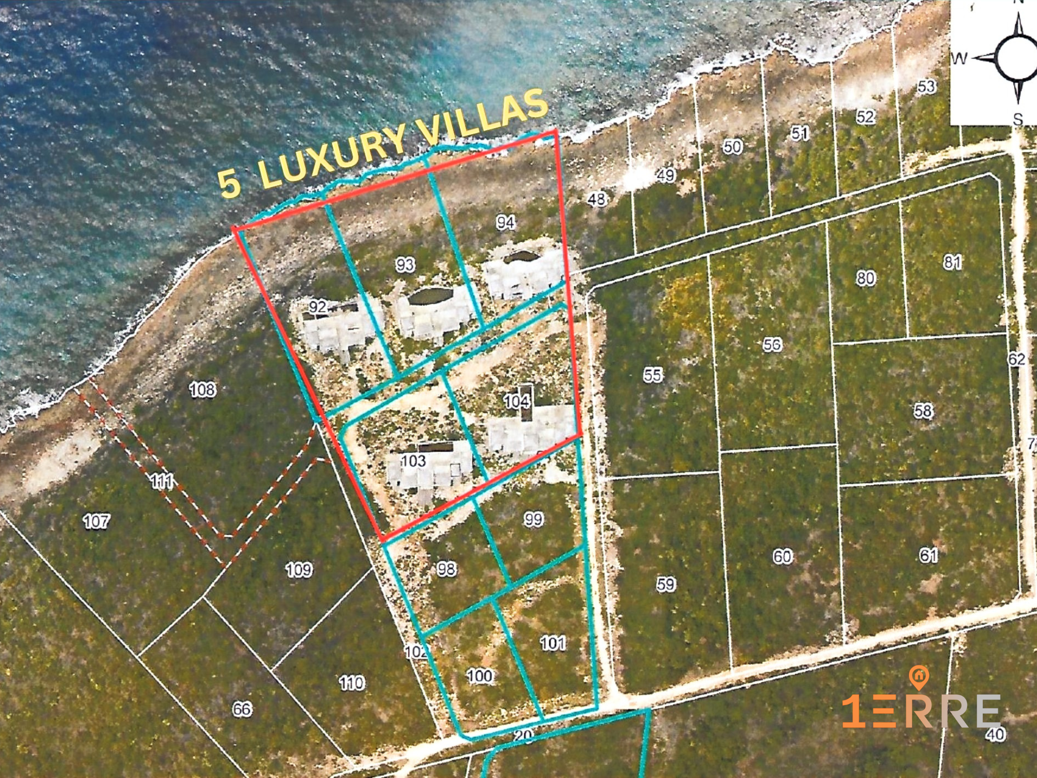 Le domaine totalise neuf parcelles. Trois parcelles d'environ 3 000 m2 chacune (? 0,75 acre) sont en front de mer ; deux autres, de superficie équivalente, sont en seconde ligne avec vue mer ; ces cinq parcelles accueillent les cinq maisons principales. Quatre parcelles supplémentaires d'environ 2 000 m2 chacune (? 0,50 acre) sont situées à l'entrée ; l'une d'elles abrite un puits d'eau douce non potable, utile aux opérations. L'ensemble peut être clos de murs et est conçu pour être desservi par une voirie intérieure menant à chaque villa.