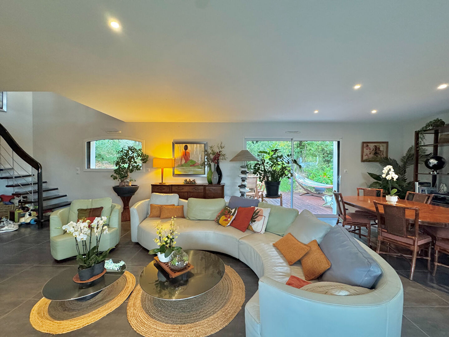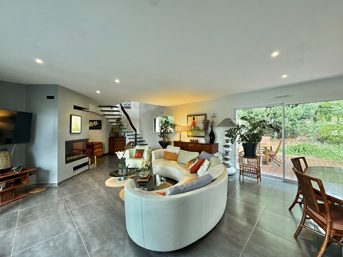 Superbe maison familiale, lumineuse et spacieuse, nichée dans un cadre calme et verdoyant, à seulement 500 m de la plage et 600 m du port. Dès l'entrée, découvrez une magnifique suite parentale en rez-de-chaussée, avec dressing sur mesure, salle de bain privative, douche et jacuzzi pour un confort absolu. L'espace de vie ouvert, baigné de lumière, réunit un salon chaleureux avec cheminée moderne et une cuisine conviviale. Ces deux pièces s'ouvrent sur deux terrasses indépendantes sans vis-à-vis, parfaites pour les repas en extérieur ou les moments de détente face à la nature. À l'étage, trois grandes chambres lumineuses, une mezzanine spacieuse pouvant servir de bureau, de coin détente ou de salle de jeux, ainsi qu'une vaste salle de bain avec baignoire jacuzzi et douche. Le jardin clos, fleuri et paysagé, sans aucun vis-à-vis, invite au calme et à la sérénité. Un grand garage complète ce bien d'exception, où confort et nature s'accordent harmonieusement.