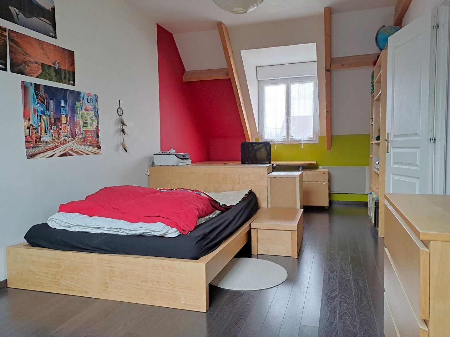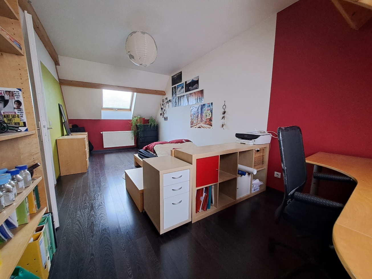 - au rez-de-chaussée élevé, d'un séjour d'environ 24m² avec poêle à bois et balcon, d'une cuisine équipée ouverte, d'un wc indépendant, d'une salle de bains, d'une chambre avec placard et d'un bureau,