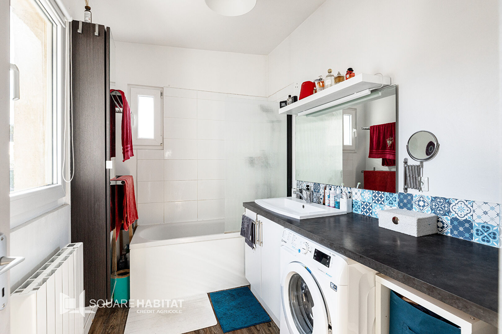 Une salle bains +un coin buanderie et des wc séparés sont également présents.