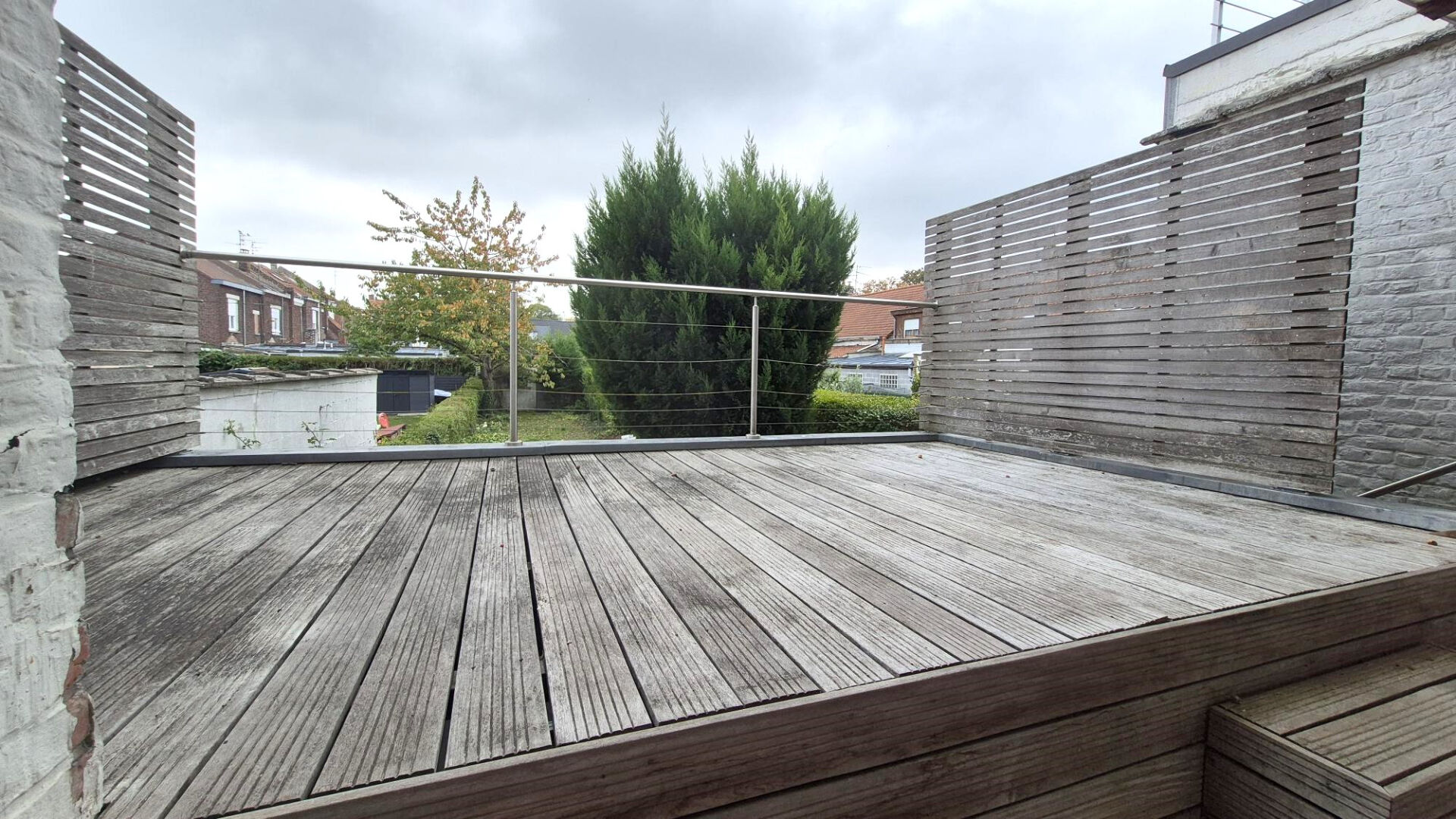 Accès direct à une grande terrasse en bois et au jardin arboré