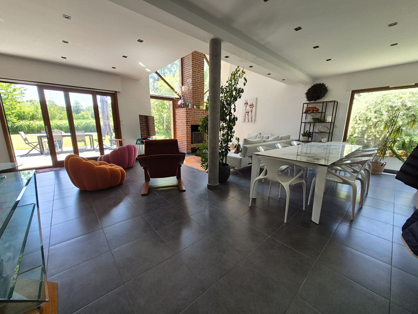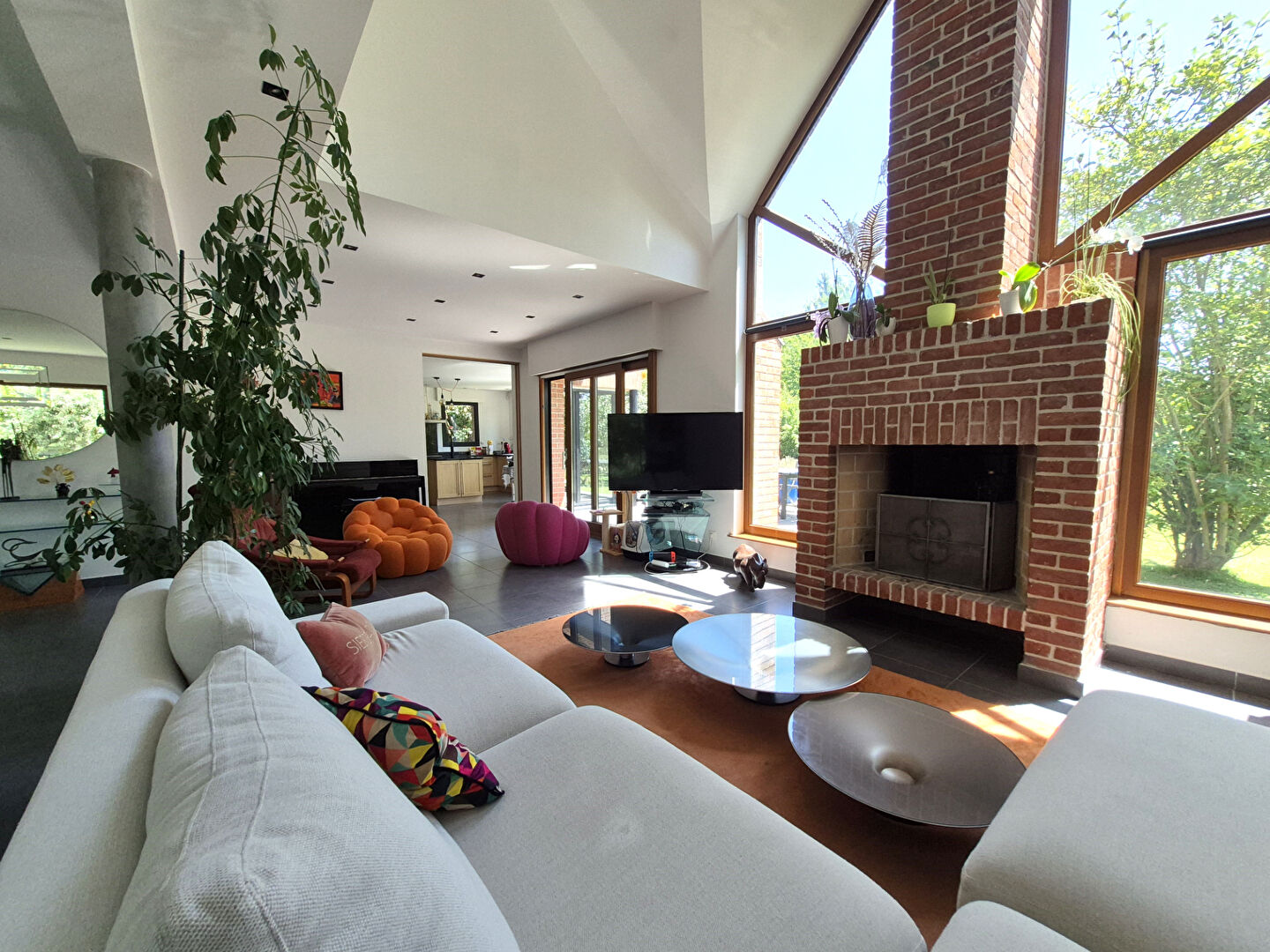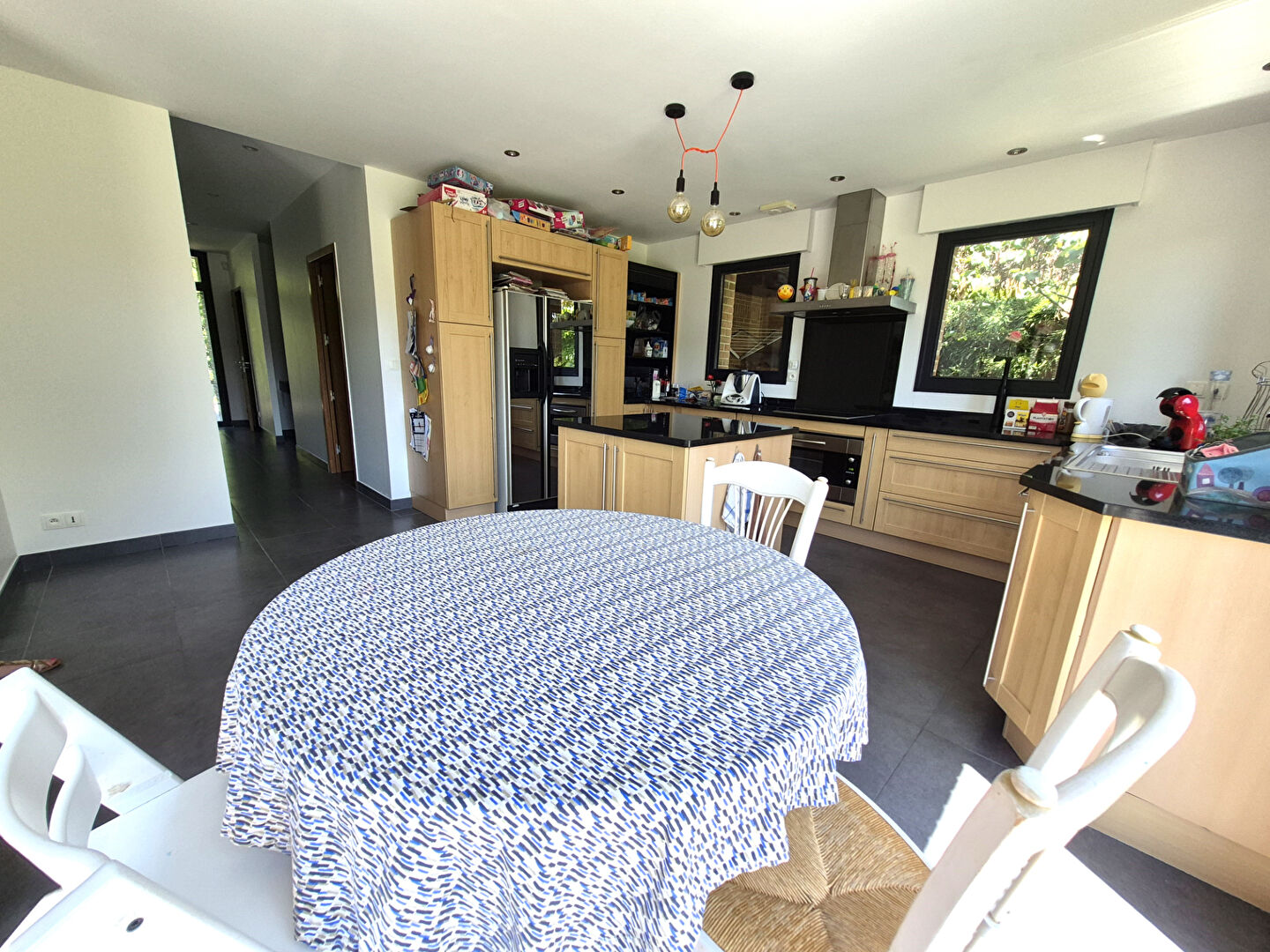 Ce pavillon d'environ 200m², en recul de route propose un hall d'entrée, un grand séjour très lumineux de plus de 50m², avec cheminée feu de bois. Une grande cuisine d'environ 20m² parfaitement équipée avec son coin repas est complétée par un cellier-buanderie très pratique.