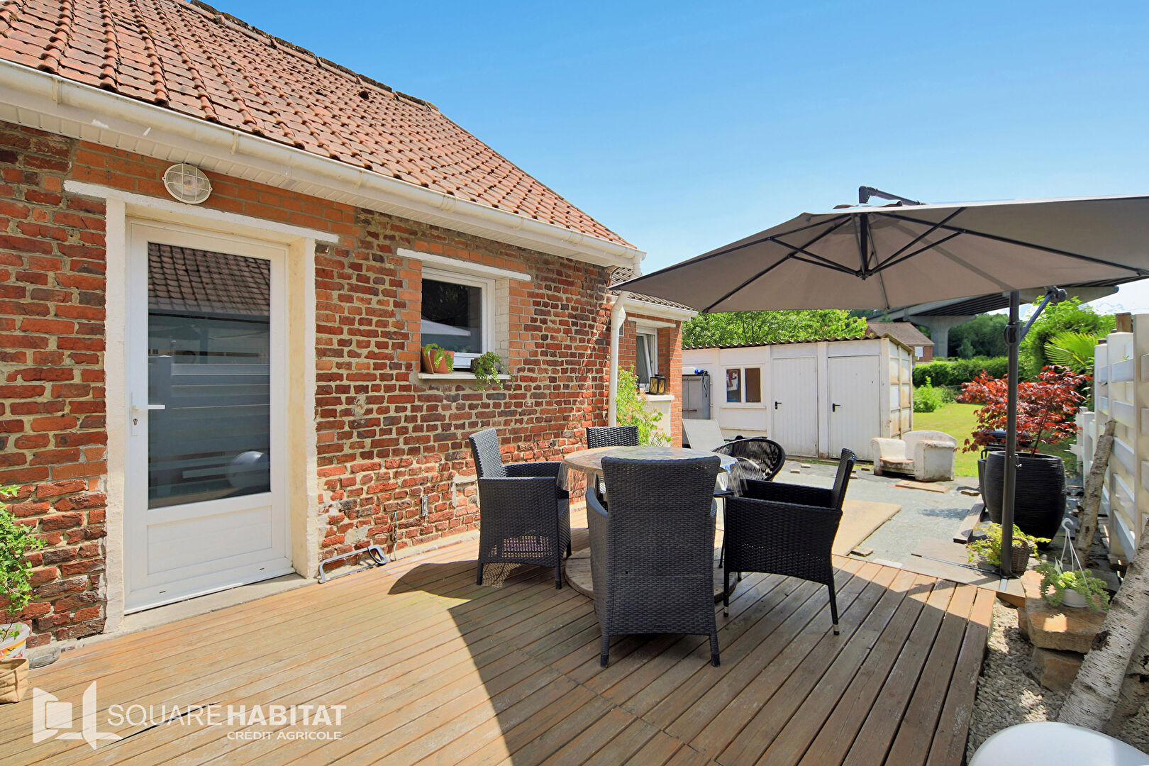 Passage latéral, terrasse en bois , dépendance pour stockage ou rangement et terrain clos. On pose les meubles!