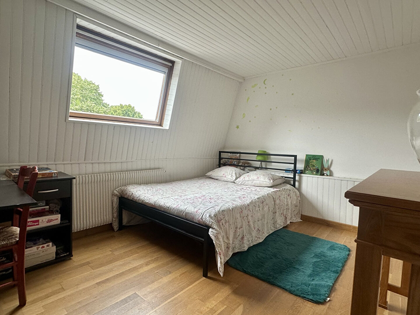 Le second étage dessert 2 chambres supplémentaires avec une salle de douches communicante ainsi qu'un grenier pour plus de rangement.