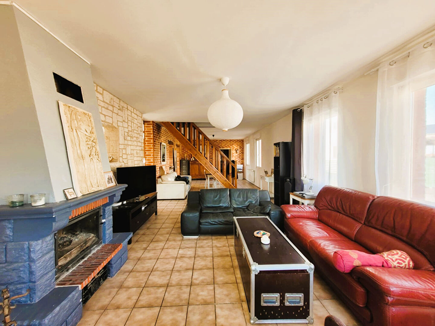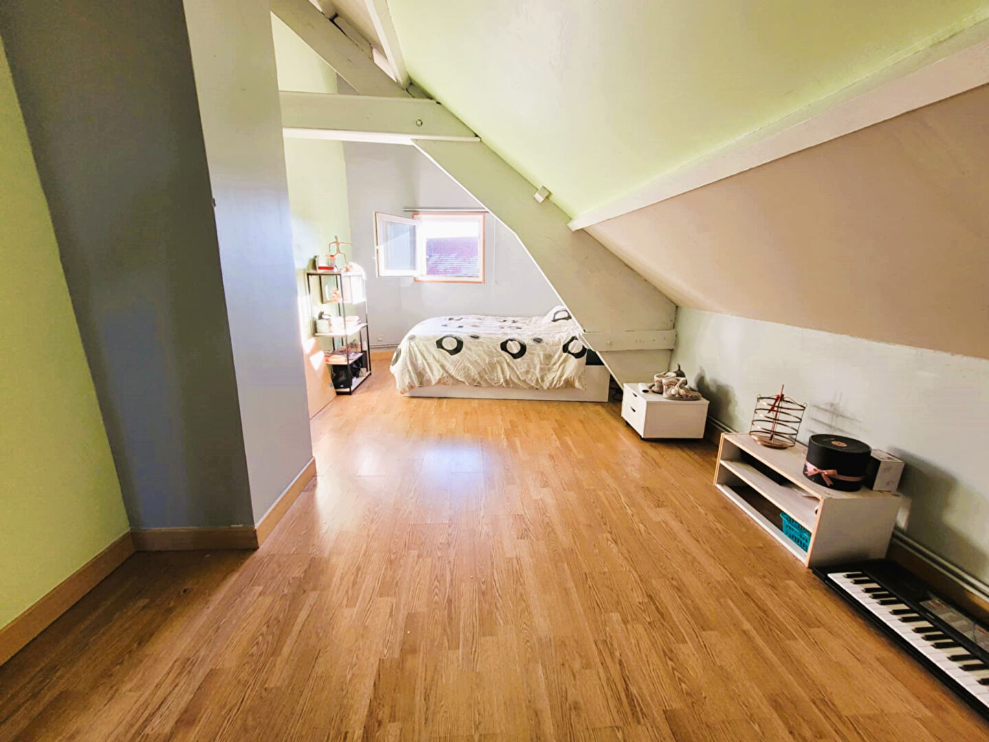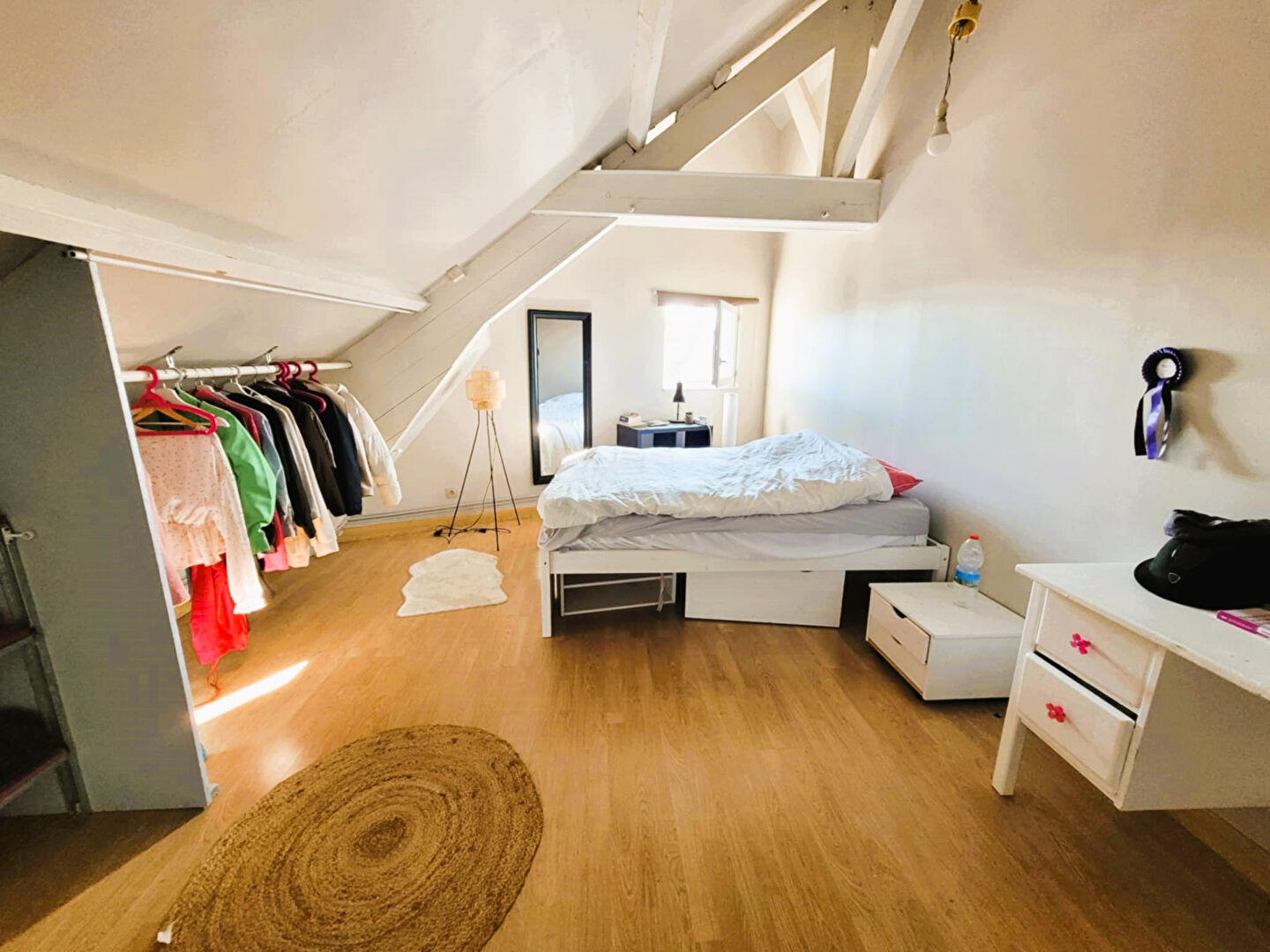 Grand séjour d'environ 50 m² avec cheminée, cuisine lumineuse aménagée et équipée avec coin repas, une chambre, une salle de bains.