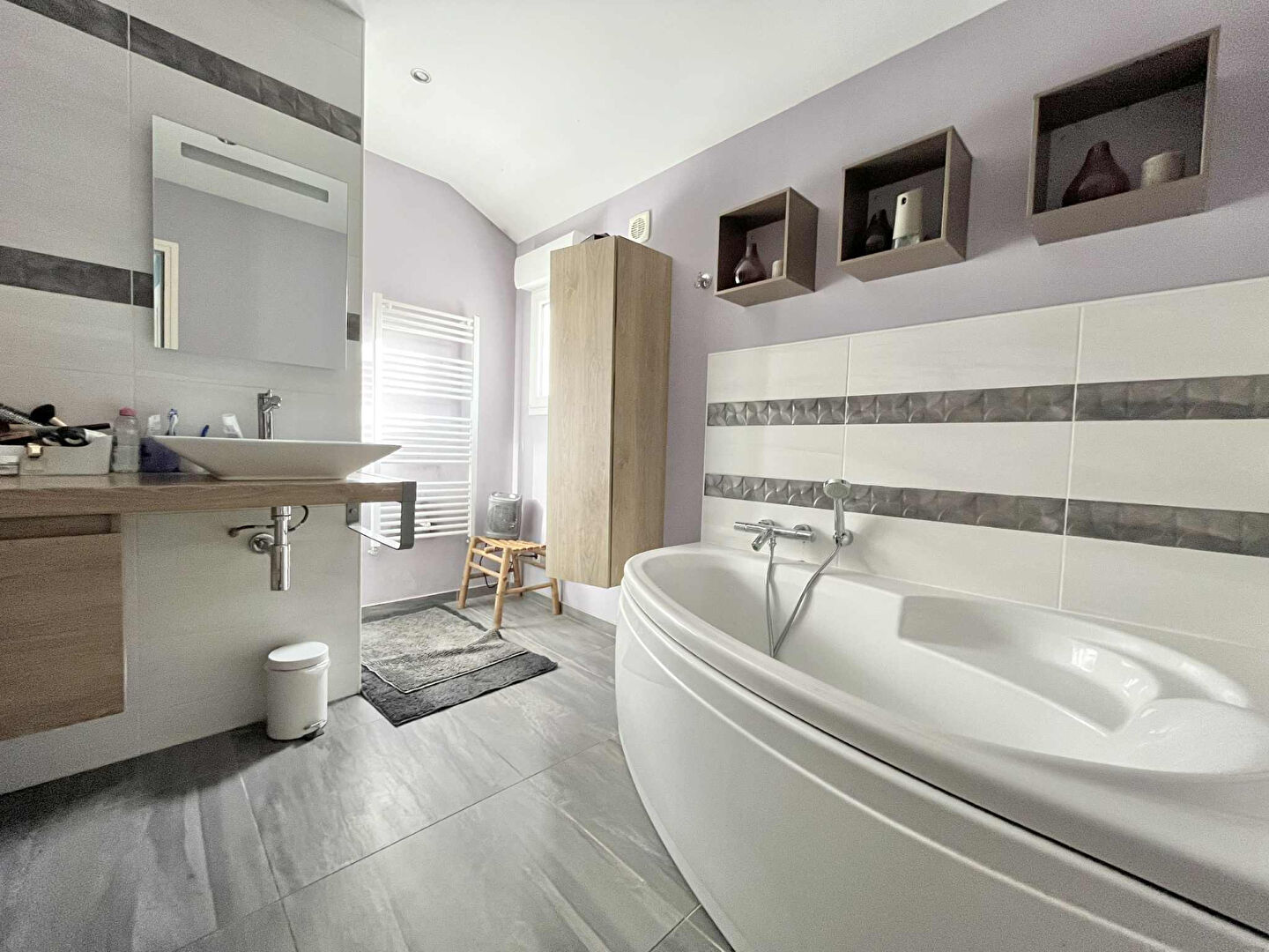 Au rez-de-chaussée : un séjour double en carrelage ancien, une cuisine pleine de charme, alliant caractère et authenticité, une salle de bain avec douche et baignoire et un bureau.