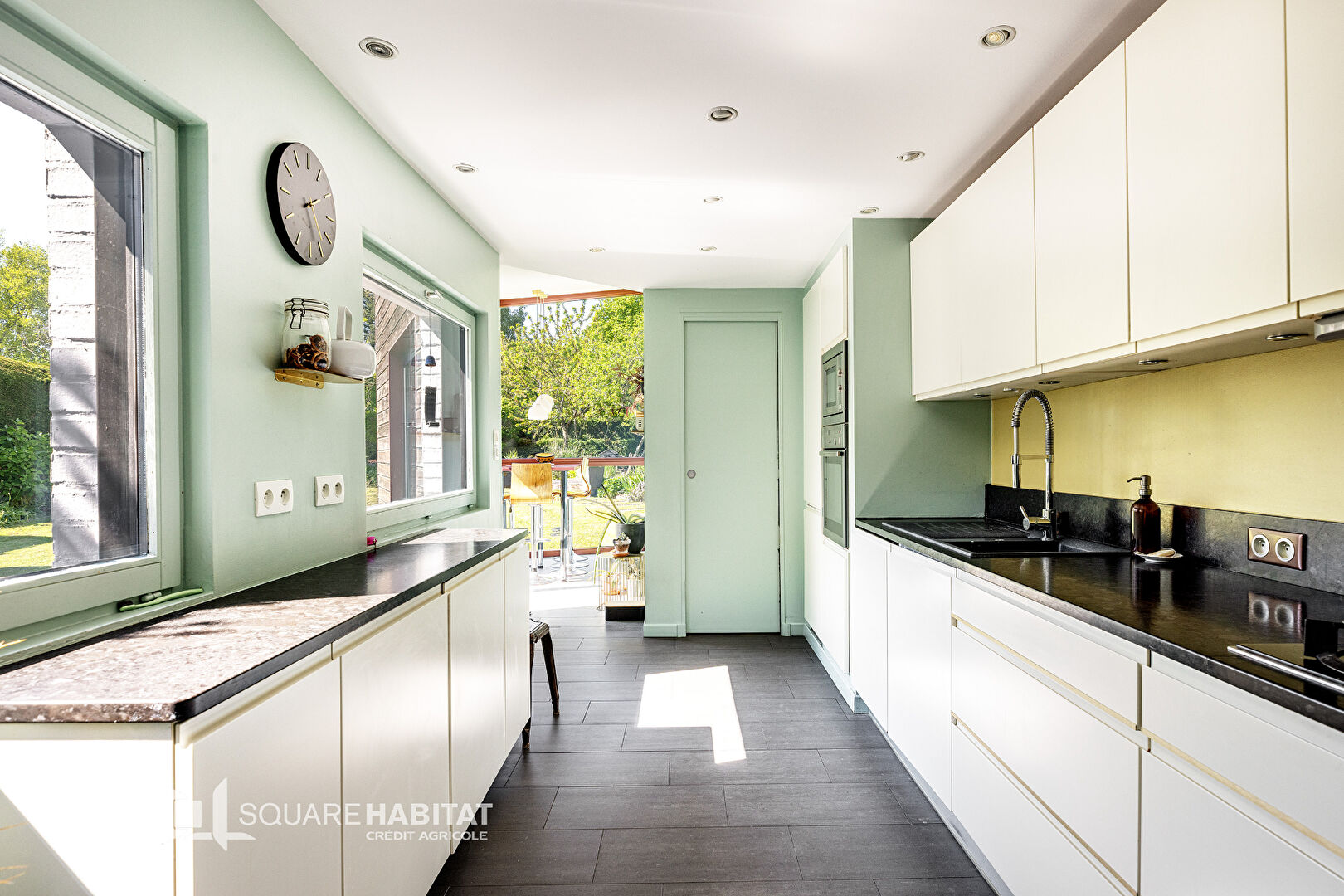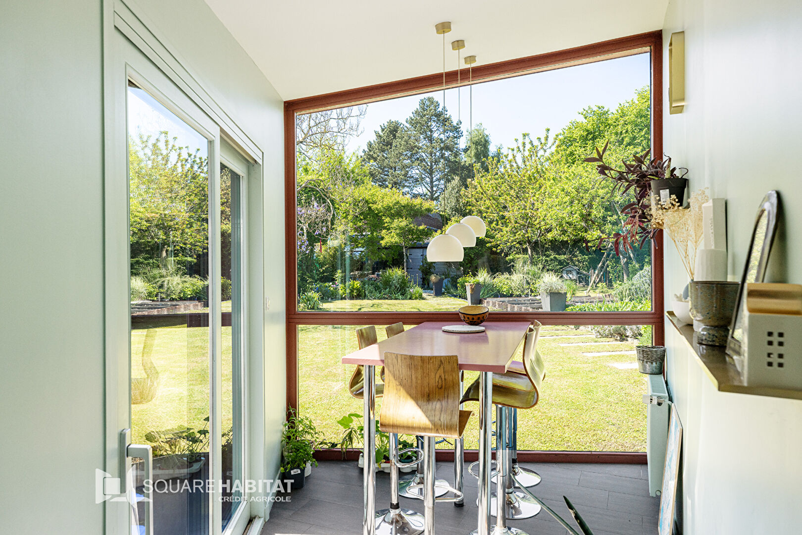 À l'arrière, une extension audacieuse et vitrée comprenant la cuisine moderne et équipée ainsi que son espace repas et son cellier/buanderie, s'ouvre sur une grande terrasse et un vaste jardin paysagé, véritable parenthèse de calme et de nature.