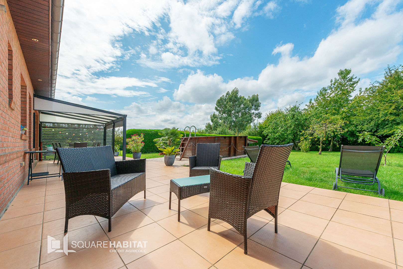 A l'exterieur: une terrasse de plus de 60m², un grand jardin cloturé et arboré et une piscine hors sol.
