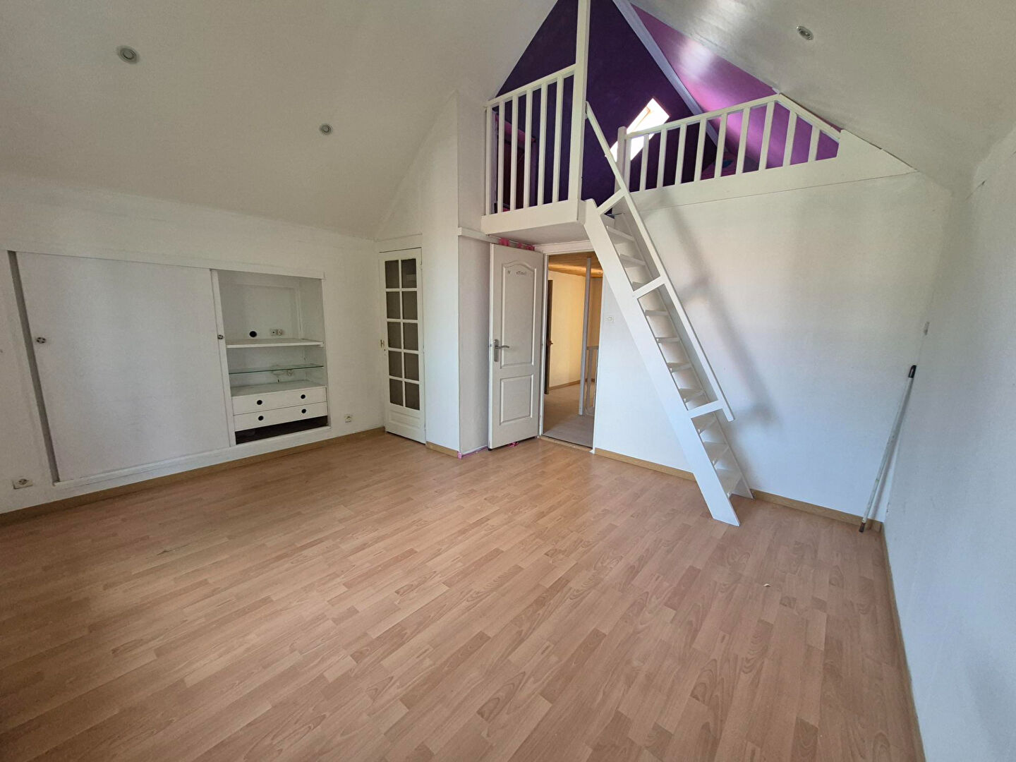 À l'étage le palier dessert 2 grandes chambres (14 m² ? 13 m²) dont une avec mezzanine (11 m² utiles), une buanderie et un espace sous pente exploitable.