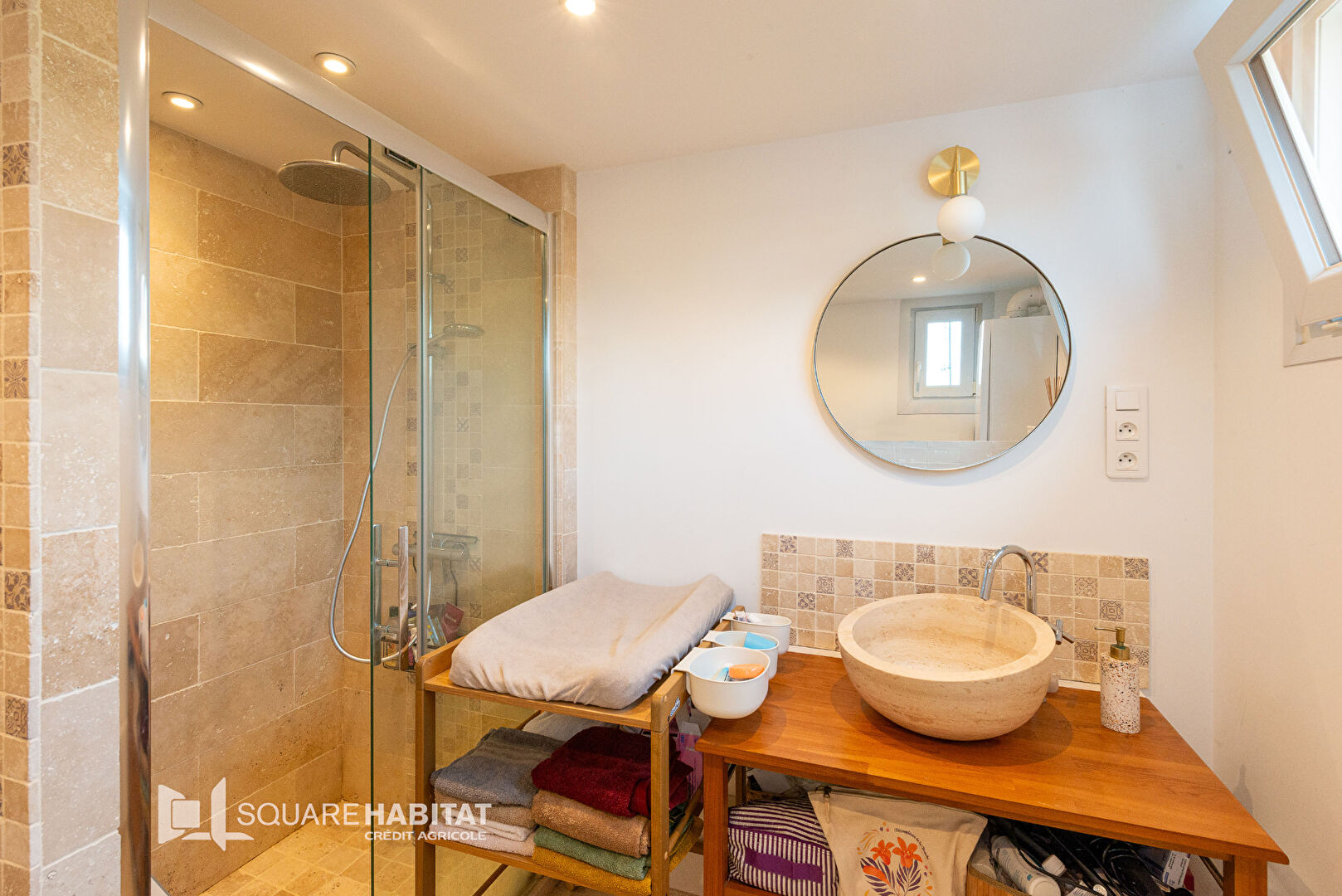 Le rez de chaussée distingue une incroyable pièce de vie menant à la cuisine sur -mesure récente et équipée et la salle de douche avec wc.