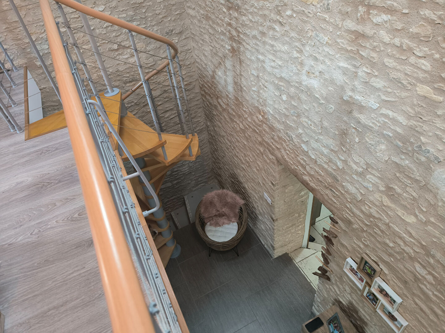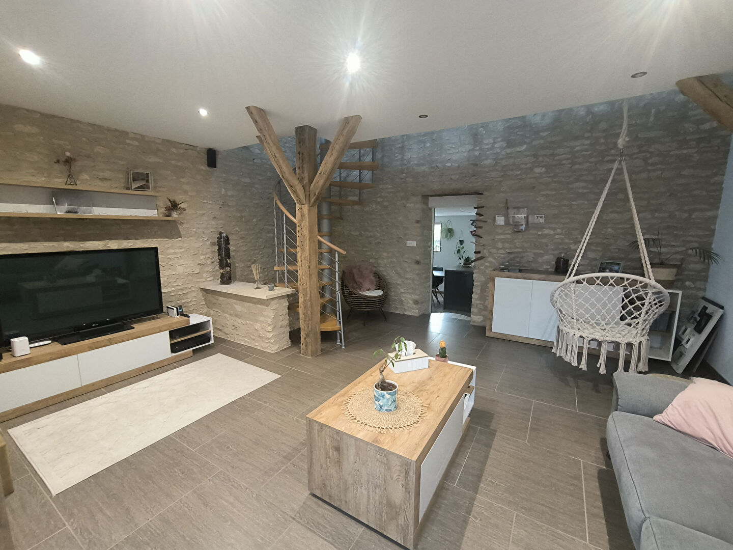 D'une surface habitable de 140 m², elle se compose au rez-de-chaussée d'un charmant séjour en pierre, d'une cuisine aménagée et équipée, ainsi que d'une pièce de vie supplémentaire menant à un couloir desservant des toilettes, un cellier et un garage attenant.