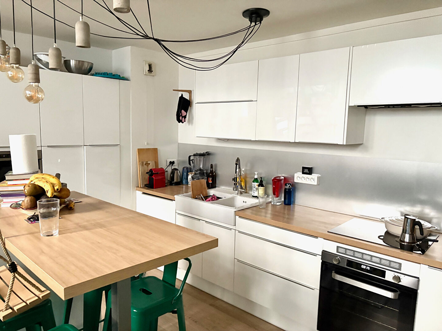 Magnifique appartement en duplex. Au 1er niveau : un séjour avec une belle hauteur sous plafond, une cuisine entièrement équipée, moderne et fonctionnelles, et un wc.