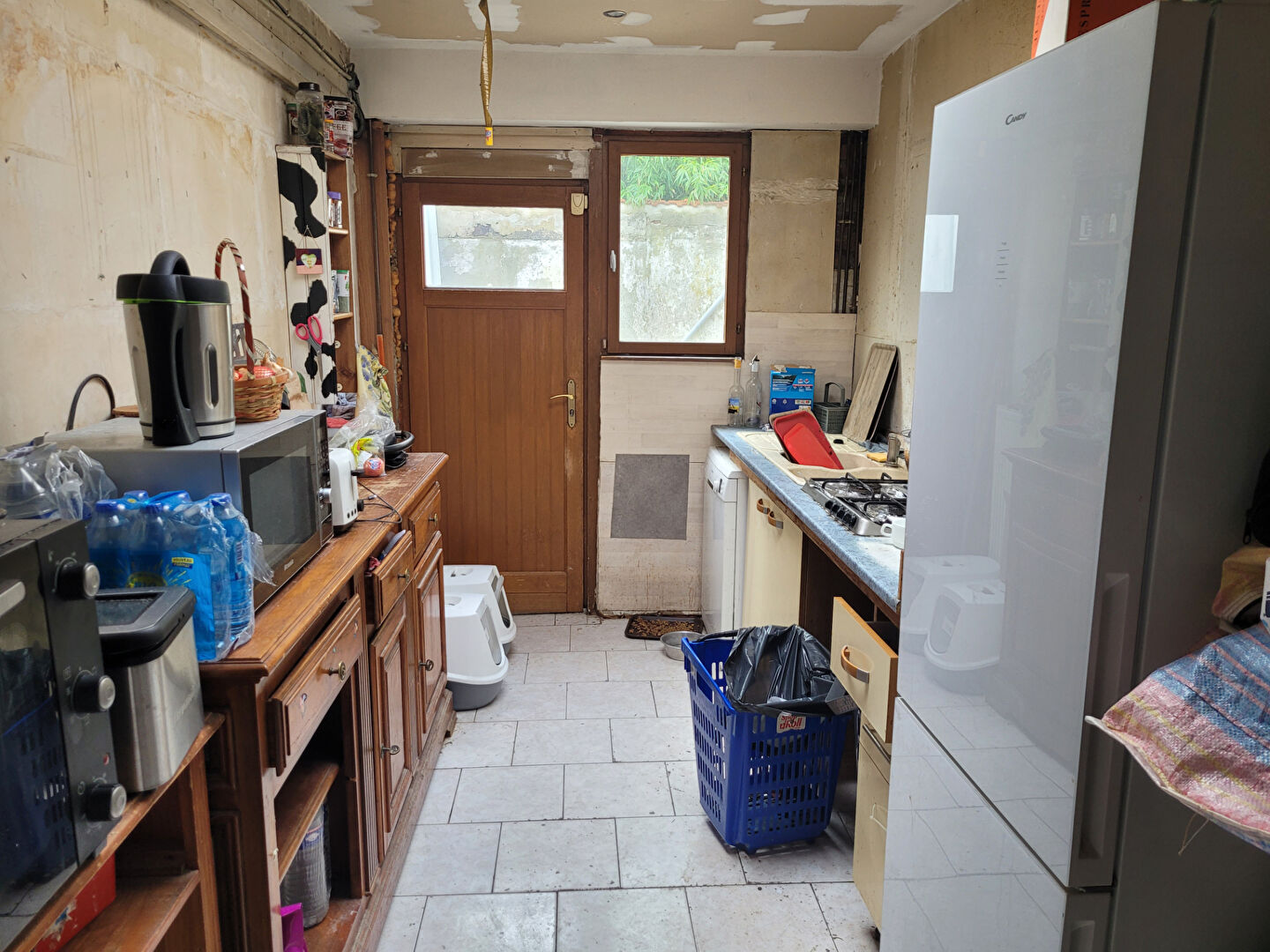 Dans une rue calme en sens unique maison offrant un séjour de plus de 30 M2, une cuisine et une salle de bains en rez-de-chaussée.