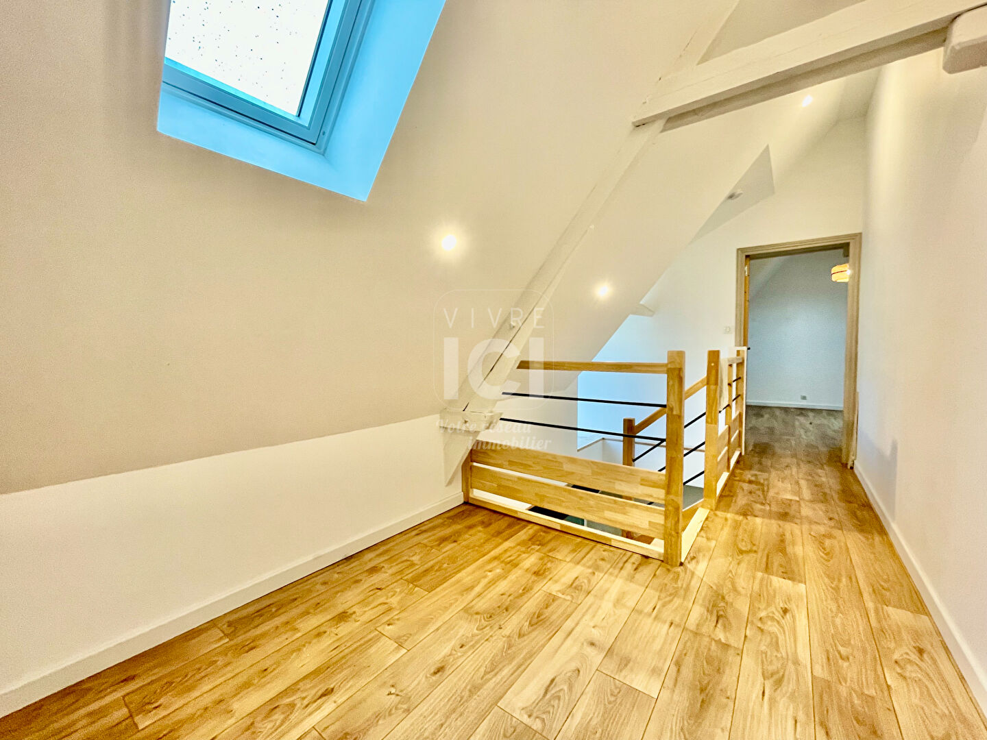 Une mezzanine desservant 3 belles chambres avec poutres apparentes.
