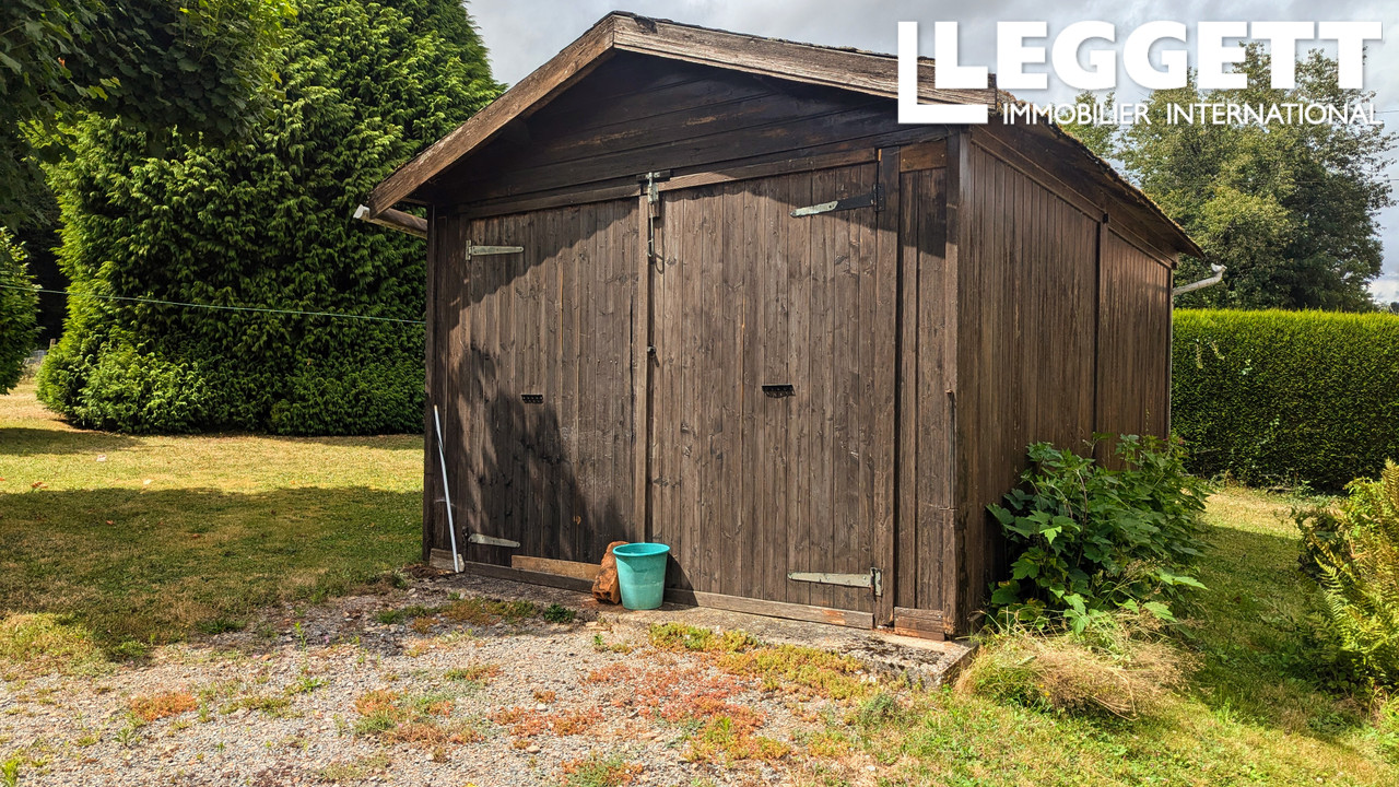 La maison est implantée au centre du terrain, offrant un jardin tout autour. Un garage en bois séparé se trouve à l'arrière.