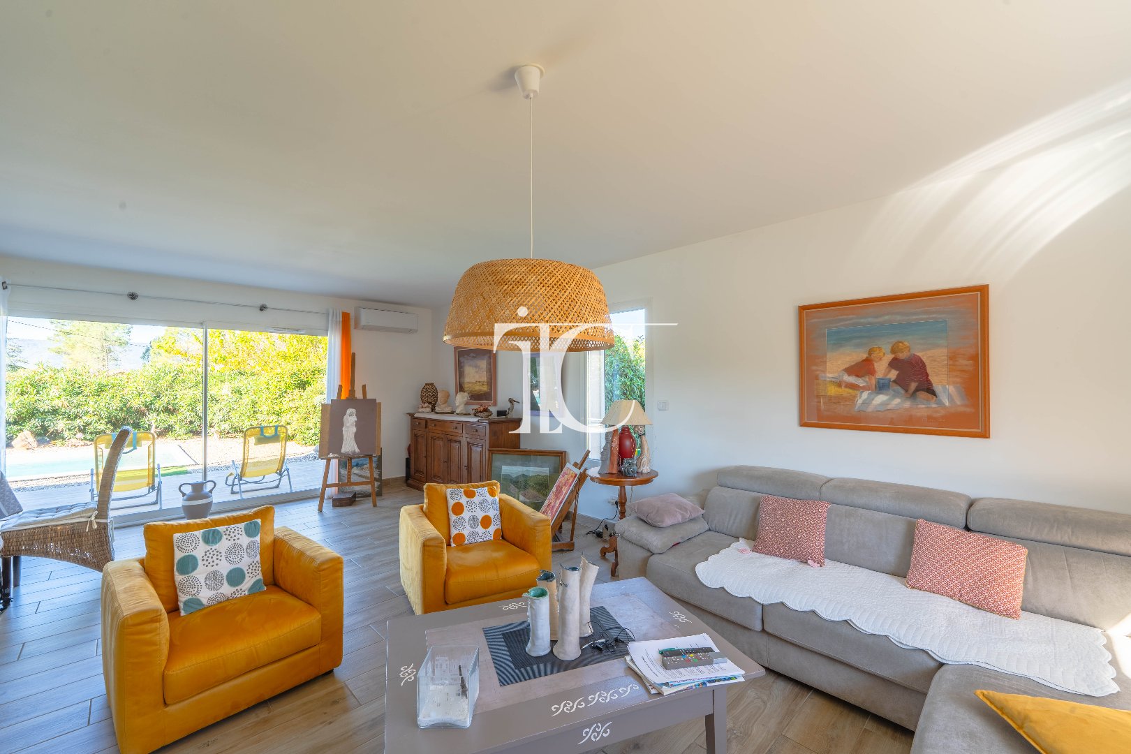 Elle comprend une pièce de vie traversante de 58 m² avec cuisine ouverte, orientée sud-ouest et prolongée par de larges baies vitrées donnant sur l'espace piscine (bassin 10 x 4 m, traitement à l'oxygène actif).