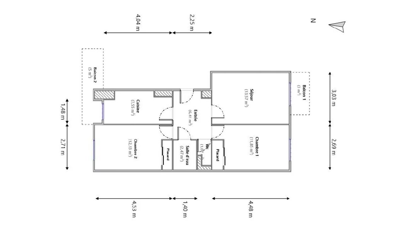 L'appartement se situe au 4ème étage (sur 7) avec ascenseur et se compose d'un hall d'entrée desservant en étoile : un séjour de 14m² (orienté S/O) donnant sur un balcon de 3m², une cuisine indépendante aménagée et équipée donnant sur un 2nd balcon de 5m², 2 chambres avec placards intégrés, une salle de douches et des WC indépendants.