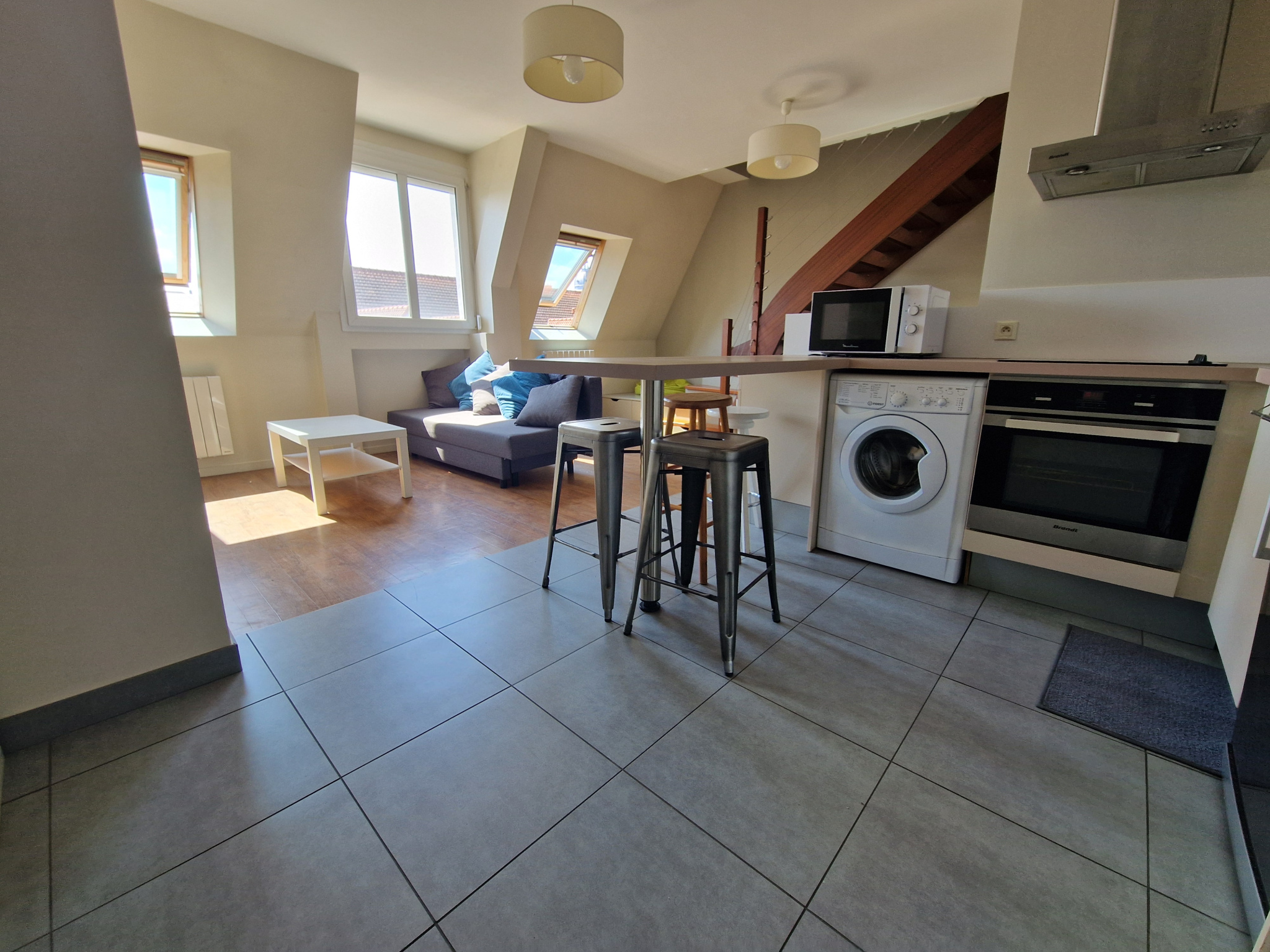 Appartement en duplex comprenant : hall d'entrée, séjour avec cuisine ouverte et équipée, salle d'eau, WC indépendant, deux chambres et une grande cave.
