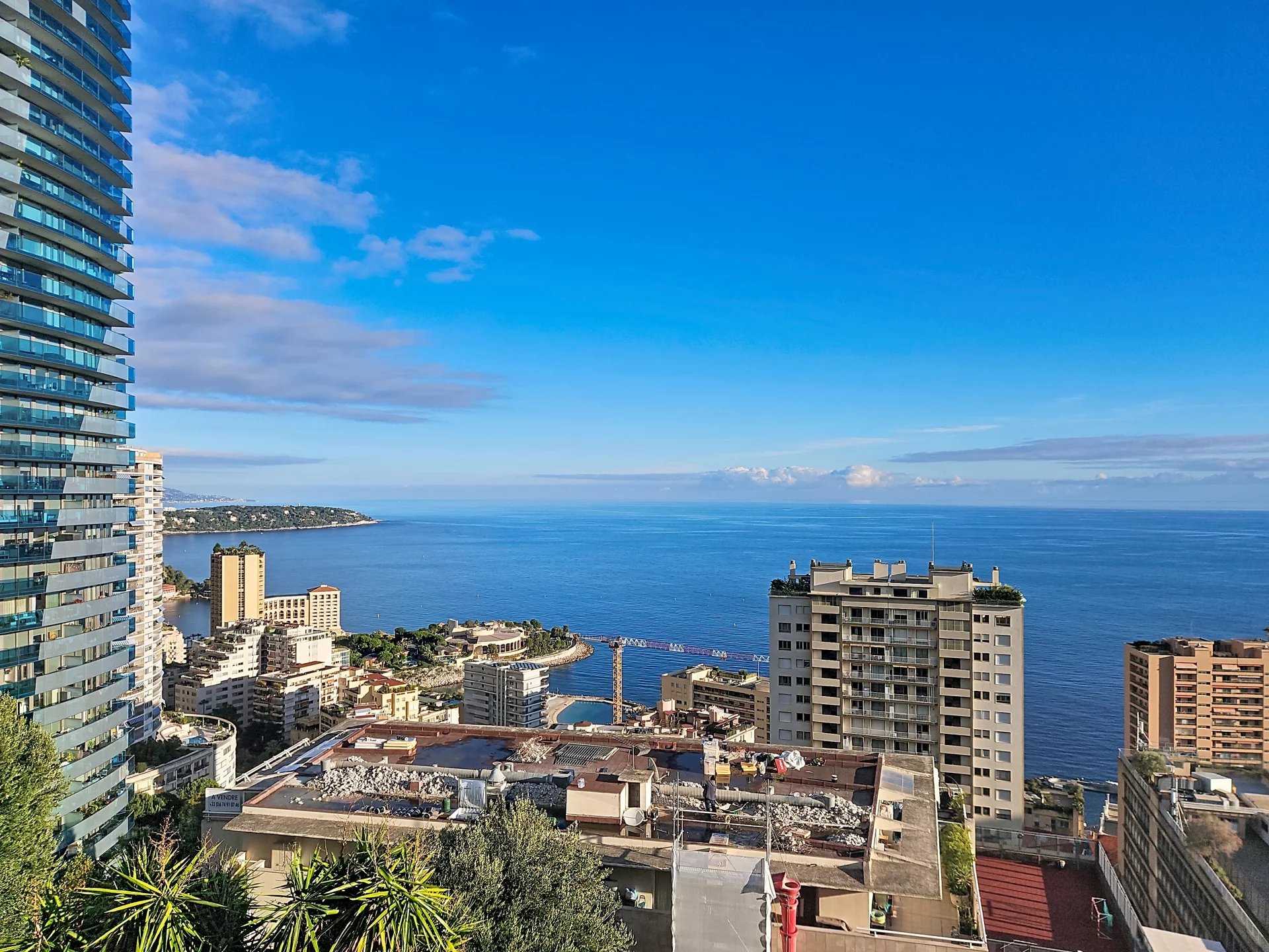 BEAUSOLEIL : Dans une résidence standing calme et sécurisée à 2 mn de Monaco, splendide appartement 3 pièces d'angle et traversant entièrement rénové d'une surface de 65 m² avec terrasses et une vue époustouflante sur la mer.